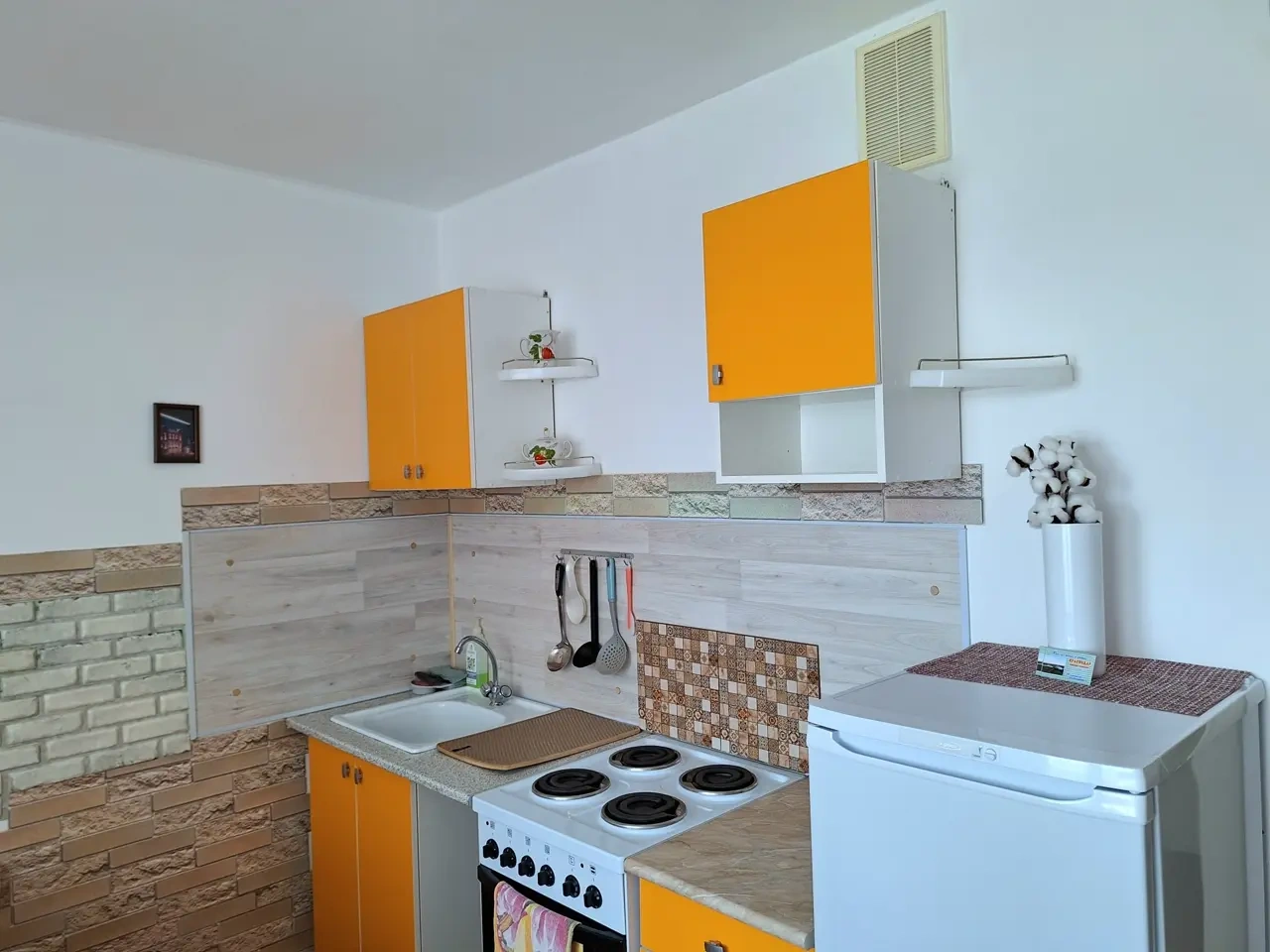 В квартире есть все необходимое для проживания - плазма с кабельным ТВ, кондиционер, электроплита, духовка, чайник, утюг, гладильная доска, посуда, приборы, чистое белье и полотенца.