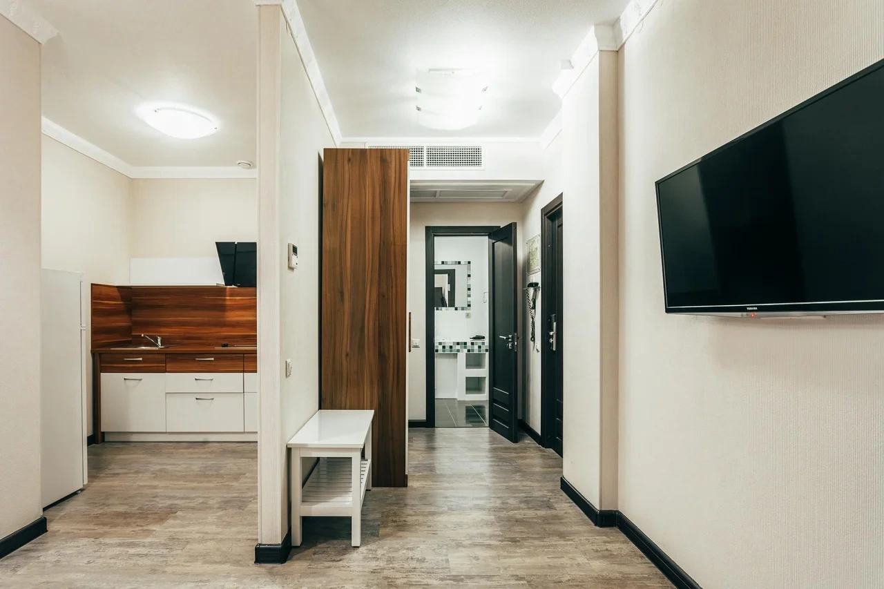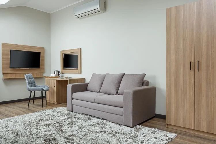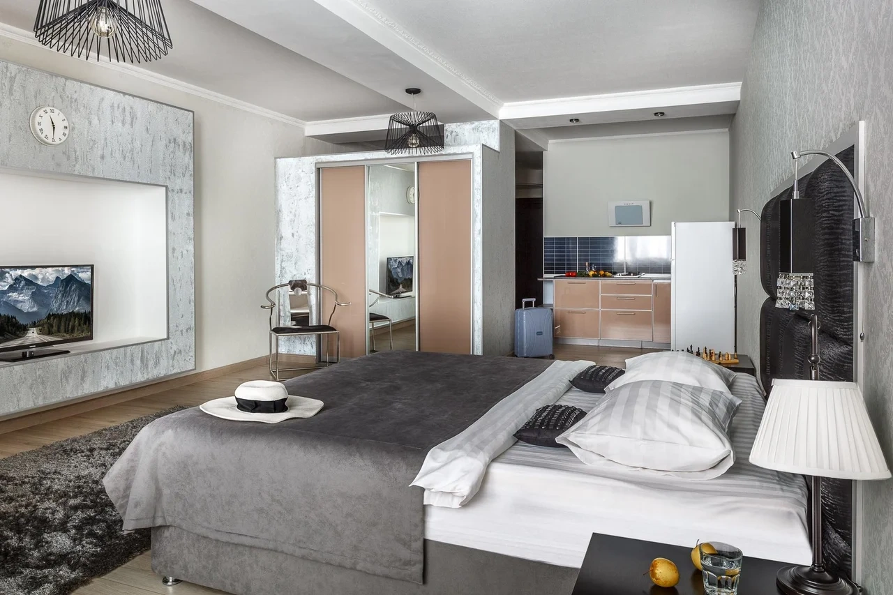 Просторный номер с кухонным уголком. Отдельный уголок с диваном и журнальным столиком, номер с отдельной гостиной комнатой и спальней. Большая ванная комната с ванной или душем. Размещение детей до 3-х лет бесплатно. Предоставляется манеж. Размещение детей от 3-х до 12 лет взимается дополнительная плата 900 рублей с предоставлением дополнительного места. Размещение детей с 12 до 18 лет взимается дополнительная плата 1500 рублей с предоставлением дополнительного места.