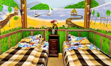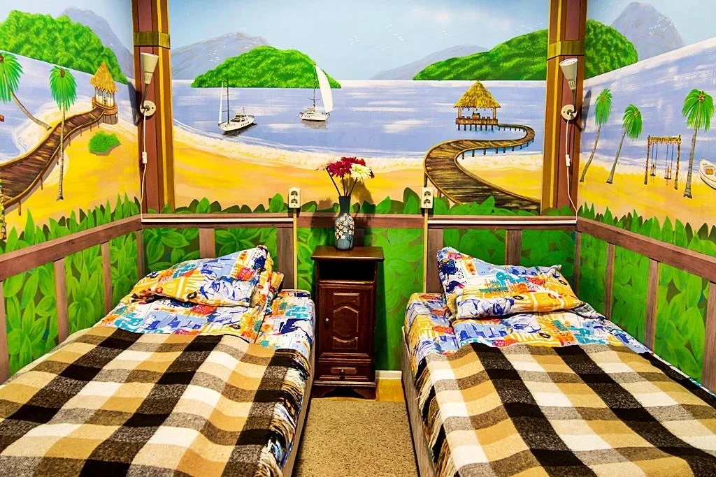 Эксклюзивный 2х местный номер, оформлен в стиле острова Мальдивы. В номере две односпальные кровати размером 90*200, которые при необходимости трансформируются в большую двуспальную кровать 180*200см. Так же в номере есть тумбочка, вешалки, зеркало, сплит-система, Wi-Fi. Постельное белье и полотенце входит в стоимость, за отдельную плату можно приобрести предметы личной гигиены и тапочки. Номер без окна, есть вентиляция и сплит-система. Цена указана за номер! Выгода просто очевидна, всего 450₽ с человека! В стоимость проживания входит постельное белье, полотенце, пользование кухней, гостиной, сан. За отдельную плату можно приобрести предметы личной гигиены и тапочки. Завтрак каша овсяная и кофе или чай на выбор - 30₽ Парковка на закрытой территории хостела - 150₽ Заезд с 14.00, выезд в 12.00, ранний заезд и поздний выезд оплачиваются дополнительно по прайсу.