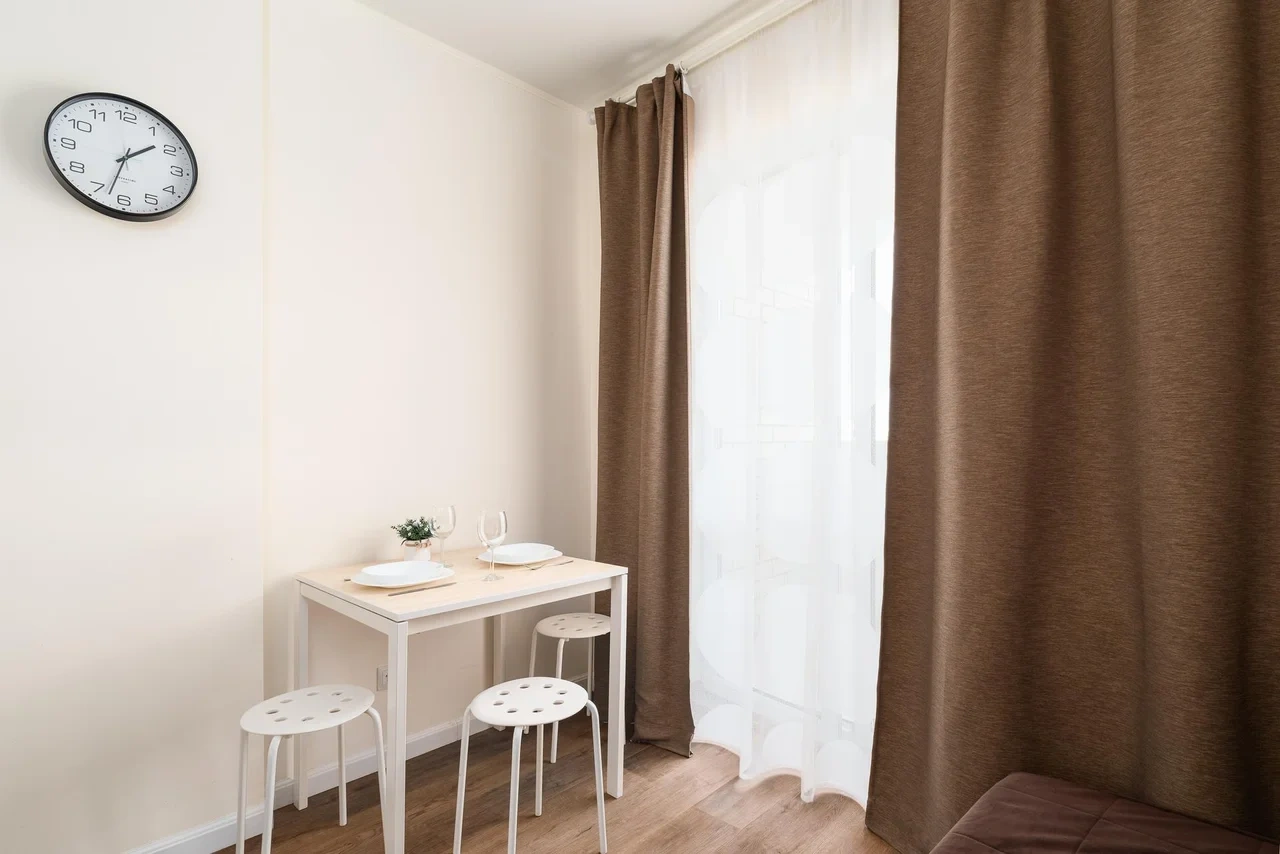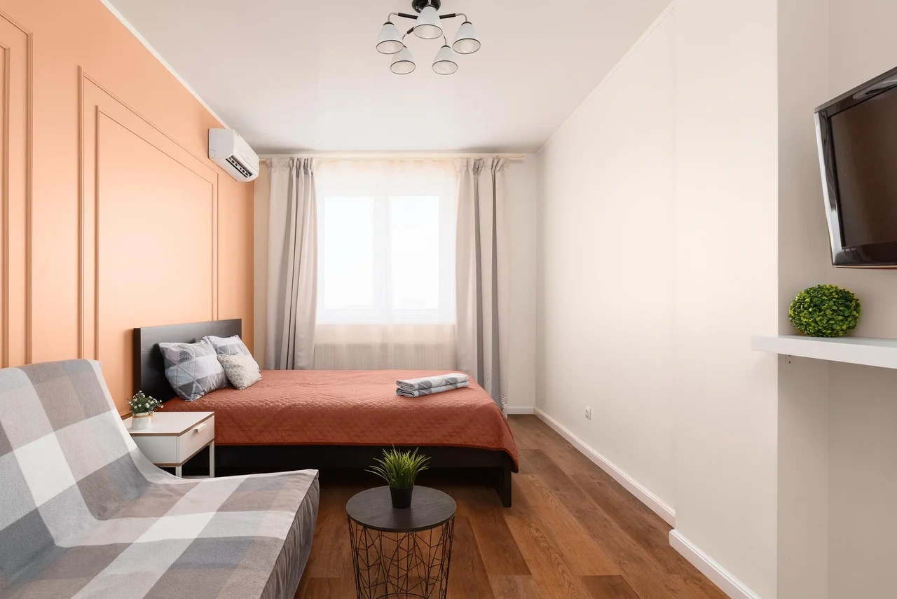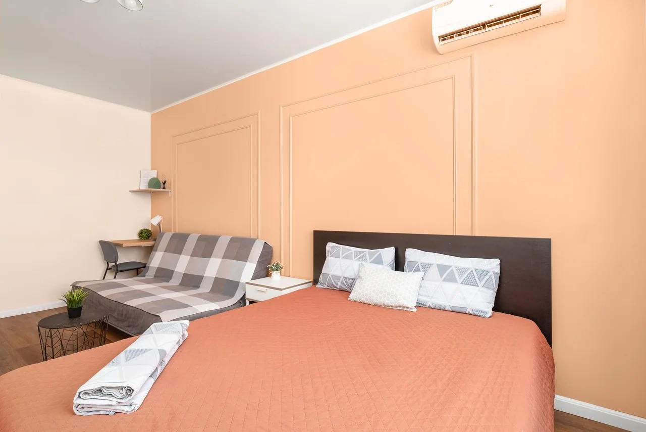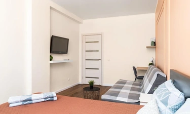 Дизайнерский ремонт выполнен в 2021 году. Эргономичное расположение мебели позволяет разместить до 5 гостей. Кухня укомплектована техникой и посудой для приготовления пищи. В спальной комнате установлены кровать с пружинным матрасом и двуспальный диван. Комната оборудована удобным рабочим местом для удаленной работы. Подключен скоростной интернет, телевидение. Спальные комплекты и полотенца предоставляются. Приветственный чай/кофе.