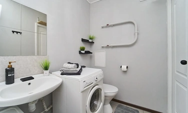 -ванна или душевая кабина, стиральная машина, полотенца, шампунь, мыло, фен, сушилка.