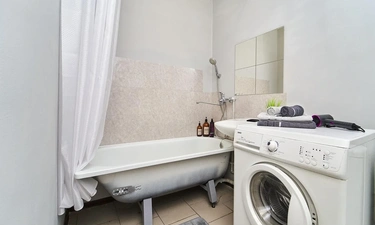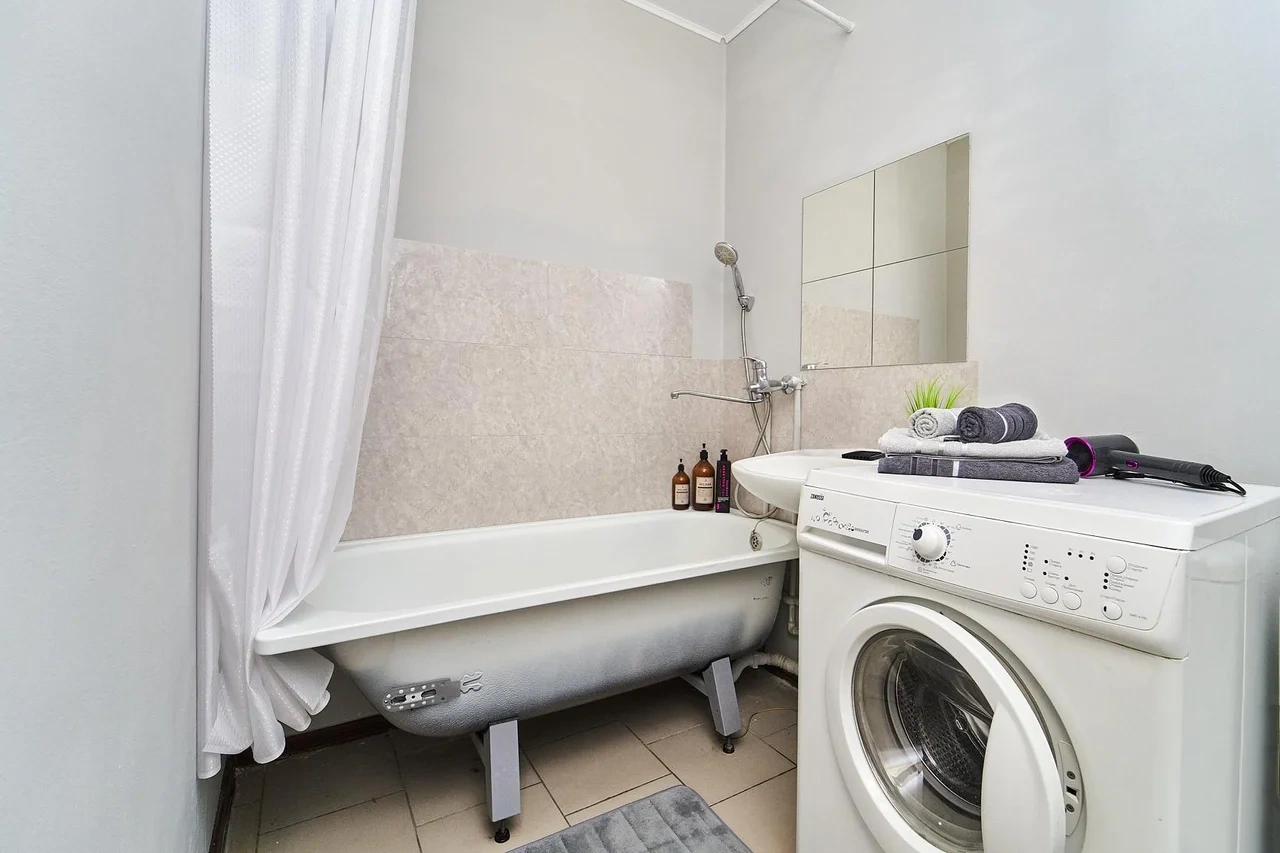 -ванна или душевая кабина, стиральная машина, полотенца, шампунь, мыло, фен, сушилка.