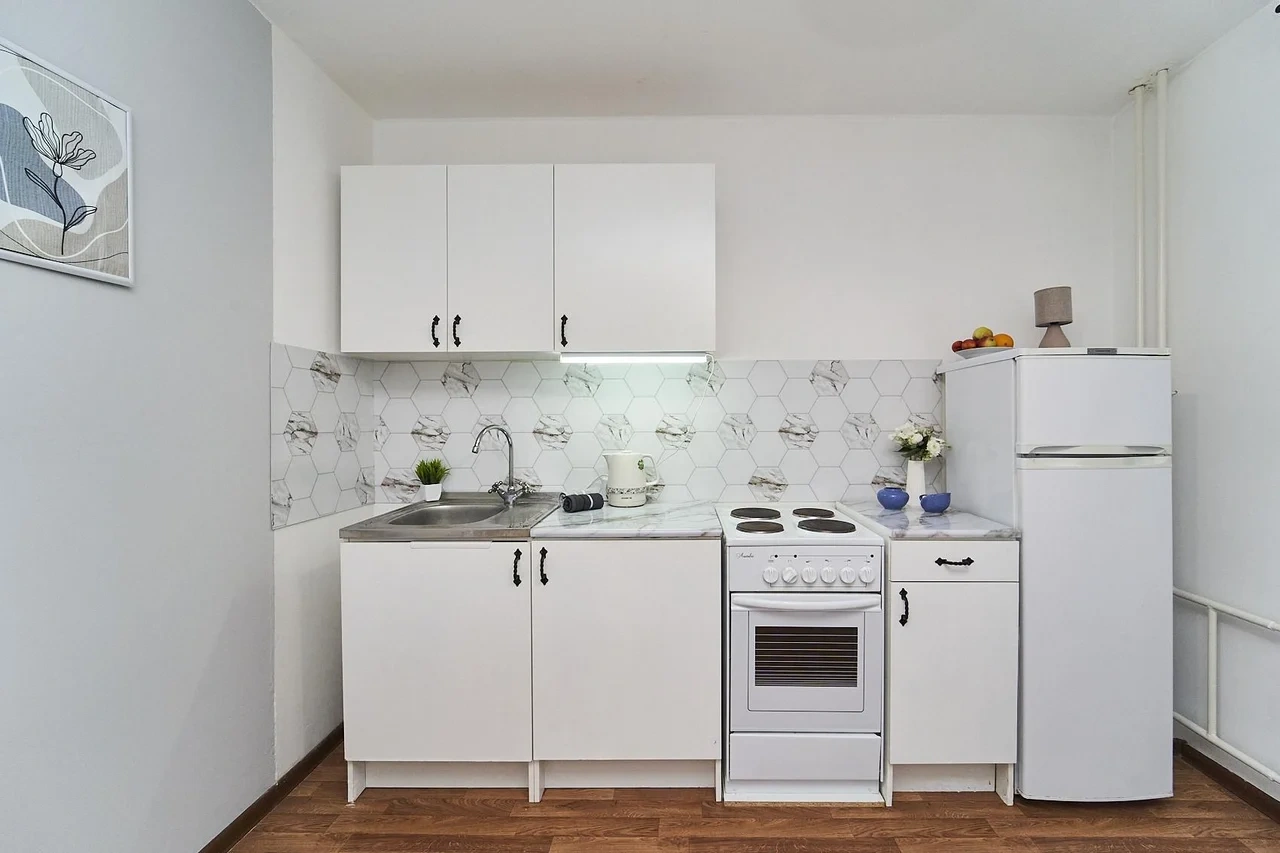 -плита, холодильник, микроволновая печь, чайник, набор посуды;