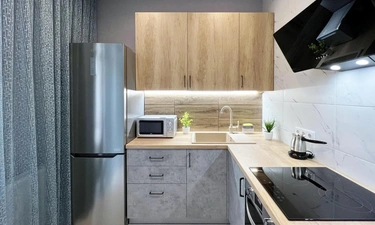 Два кондиционера (сплит-системы), стиральная машина, холодильник, электроплита, духовой шкаф, чайник, электрическая турка для кофе, фен, микроволновка
