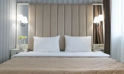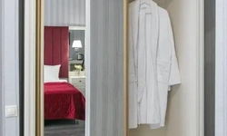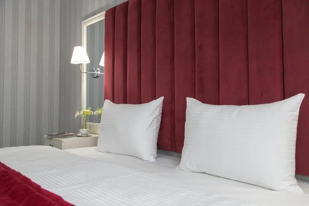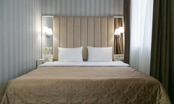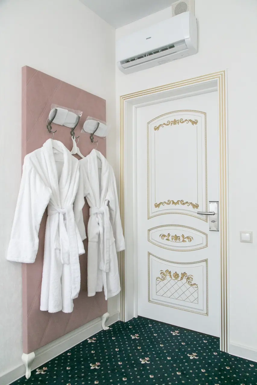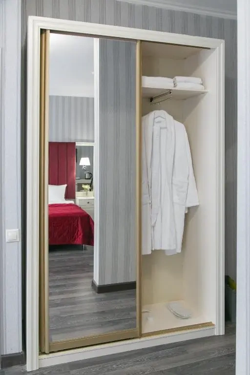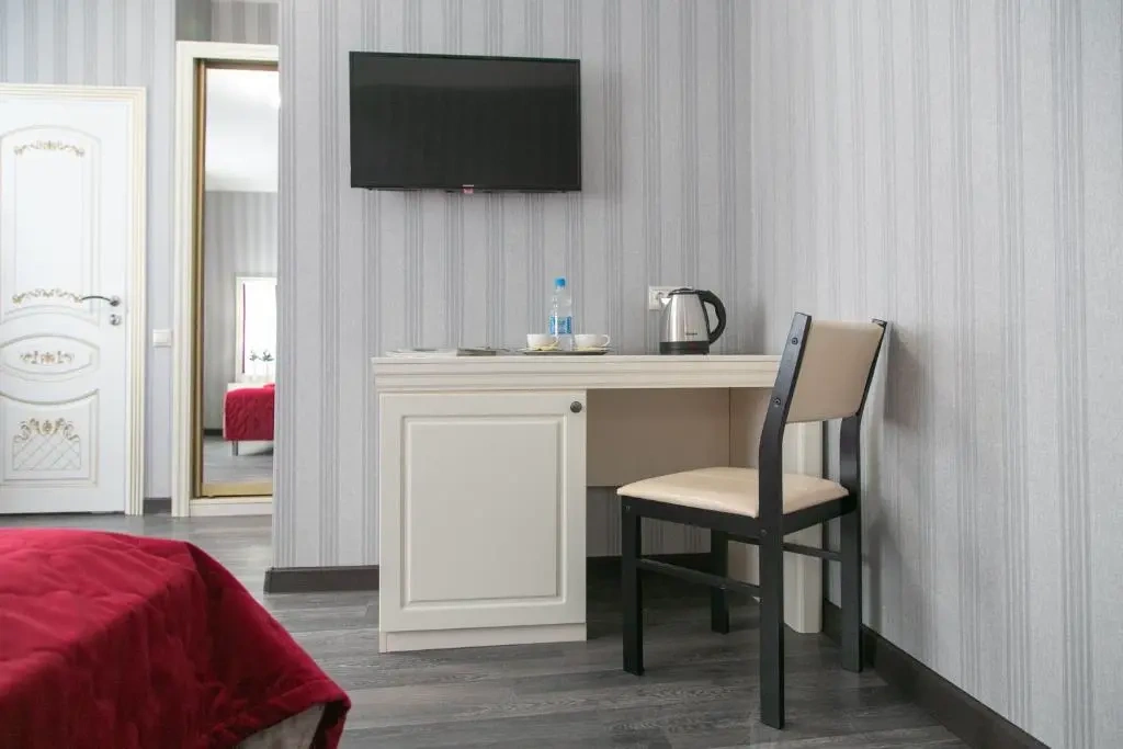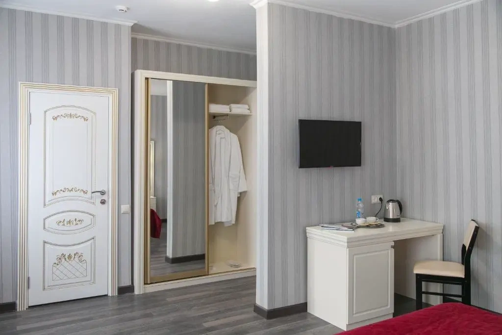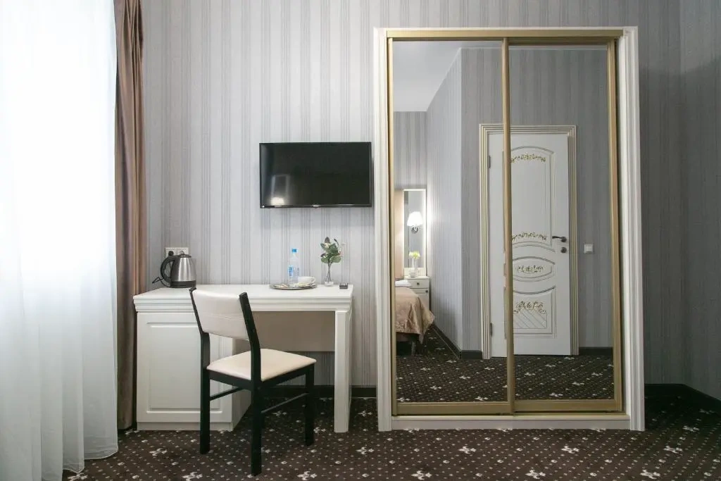 Двухместный номер Делюкс оснащен одной двуспальной кроватью размера king-size (200*200 см) и оборудован всем необходимым для комфортного проживания: телевизором, электрочайником, прикроватными бра, розетками, тумбочками, ортопедическим матрацем, который обеспечит комфортный отдых любому, даже самому восприимчивому Гостю. Номер категории Люкс также оснащен письменным столом и шкафом. Собственная ванная комната оборудована душем, зеркалом, феном. Тапочки, вафельный халат и туалетные принадлежности (мыло, шампунь, гель для душа, зубной набор), а также чайная пара предоставляются бесплатно. WI-FI работает на всей территории отеля и предоставляется бесплатно. Вид из номера на тихую улицу. Площадь номера = 20м².