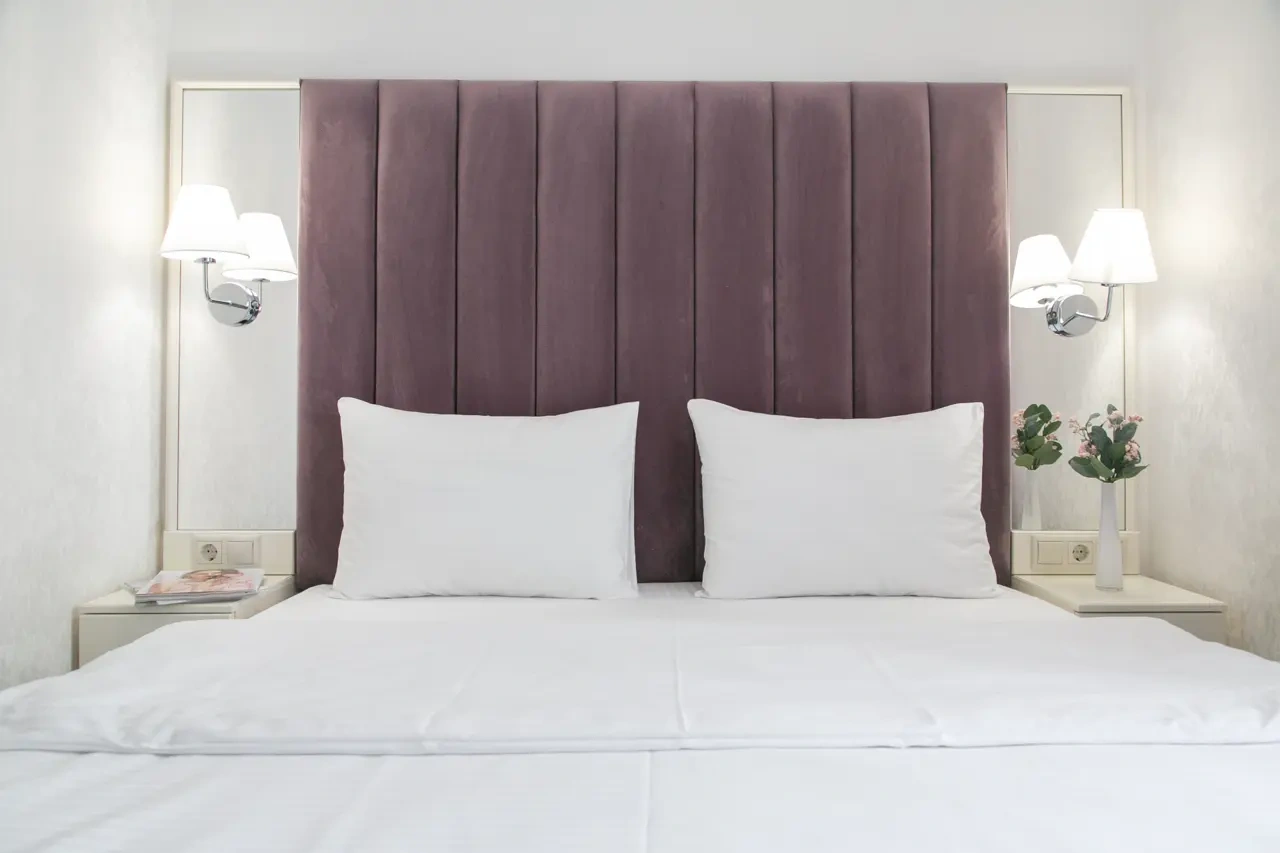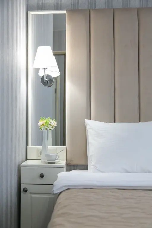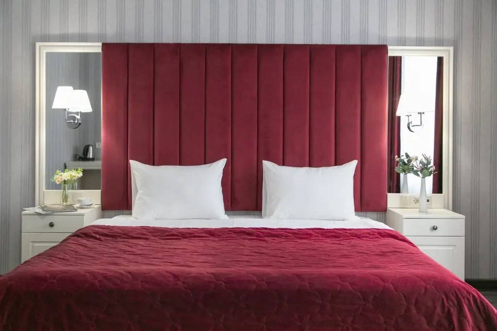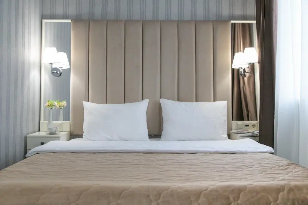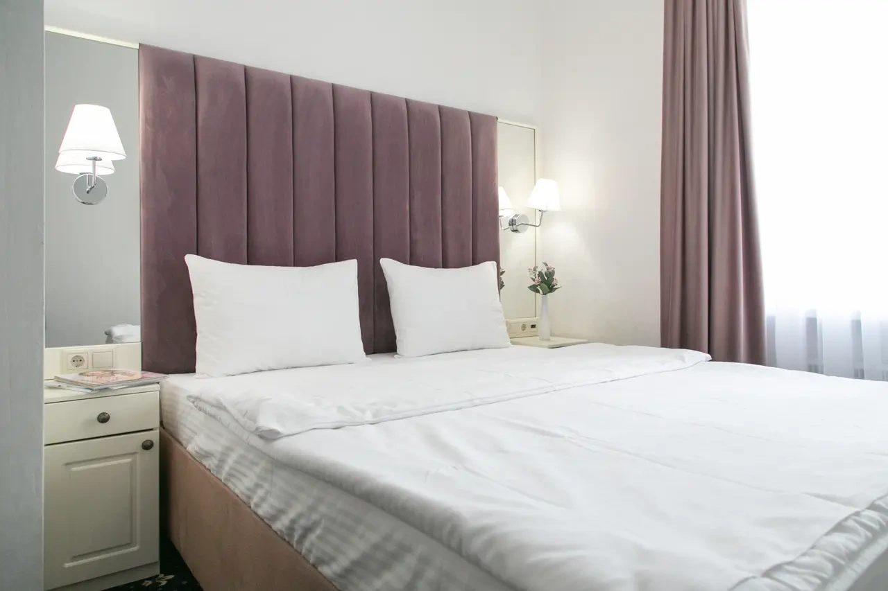 Улучшенный двухместный номер оснащен одной двуспальной кроватью размера king-size (180*200 см) и оборудован всем необходимым для комфортного проживания: телевизором, электрочайником, прикроватными бра, розетками, тумбочками, ортопедическим матрацем, который обеспечит комфортный отдых любому, даже самому восприимчивому Гостю. Все номера категории Улучшенный также оснащены письменным столом и шкафом. Собственная ванная комната оборудована душем, зеркалом, феном. Тапочки, вафельный халат и туалетные принадлежности (мыло, шампунь, гель для душа, зубной набор), а также чайная пара предоставляются бесплатно. WI-FI работает на всей территории отеля и предоставляется бесплатно. Вид из номера на тихую улицу или во двор. Площадь номера = 18м².