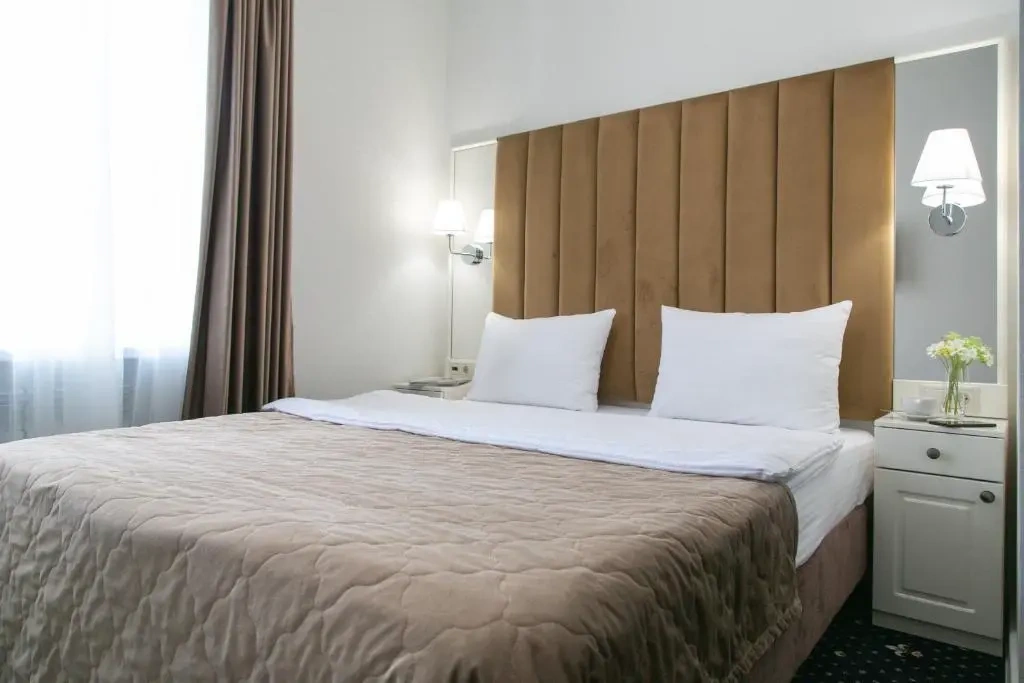 Стандартный двухместный номер оснащен одной двуспальной кроватью (160*200 см) и оборудован всем необходимым для комфортного проживания: телевизором, электрочайником, прикроватными бра, розетками, тумбочками, ортопедическим матрацем, который обеспечит комфортный отдых любому, даже самому восприимчивому Гостю. Многие номера категории Стандарт также оснащены письменным столом и шкафом/напольной вешалкой. Собственная ванная комната оборудована душем, зеркалом, феном. Тапочки и туалетные принадлежности (мыло, шампунь, гель для душа), а также чайная пара предоставляются бесплатно. WI-FI работает на всей территории отеля и предоставляется бесплатно. Вид из номера на тихую улицу или во двор. Площадь номера = 14м².