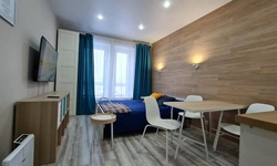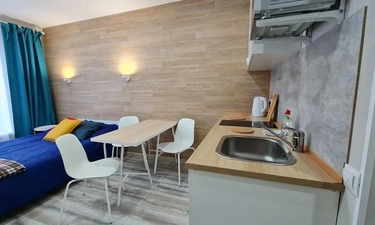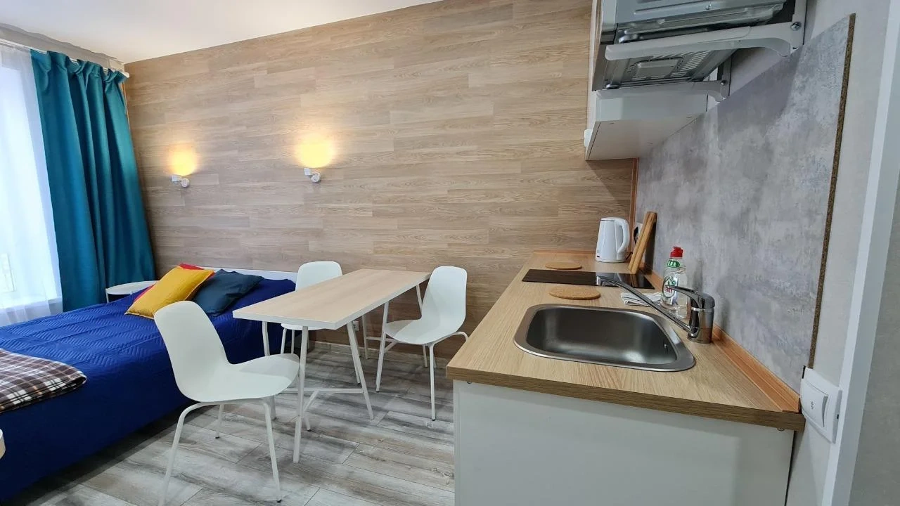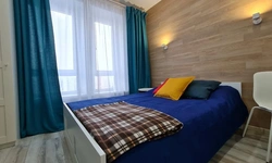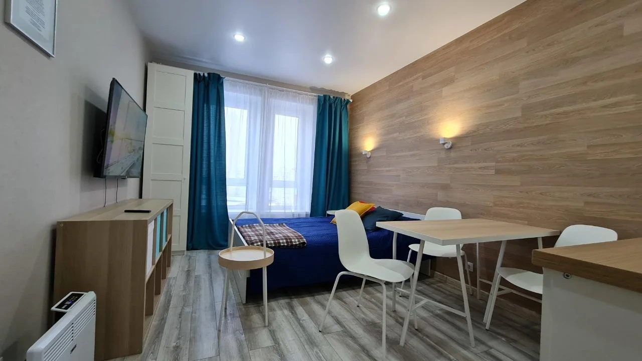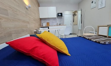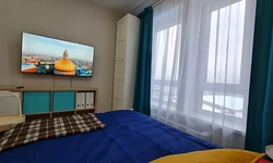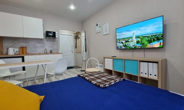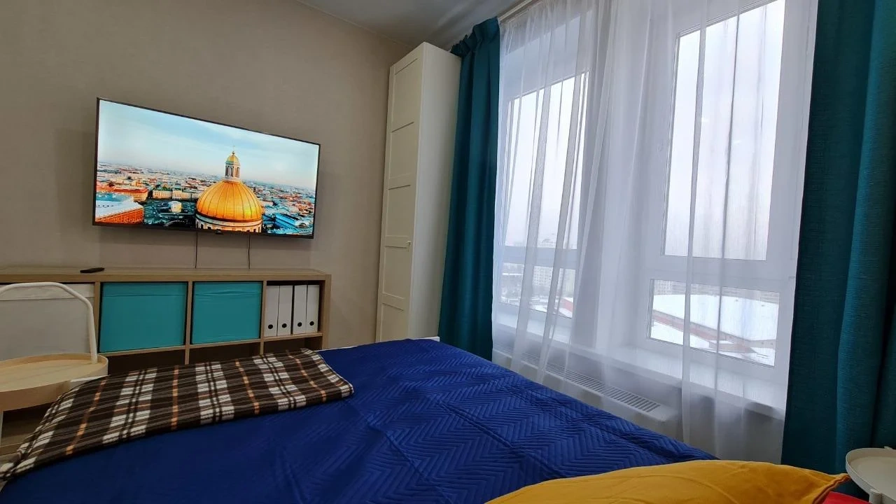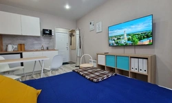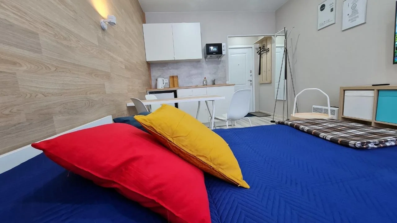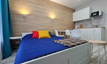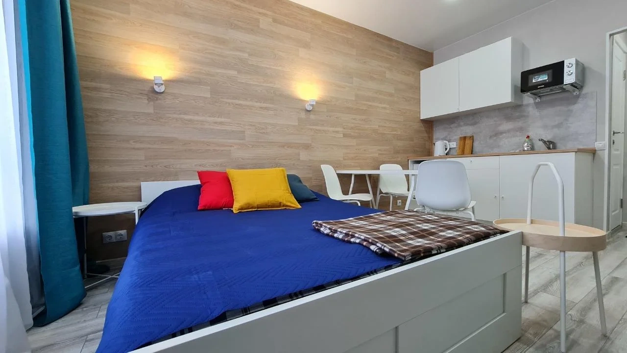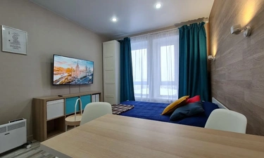 В данной квартире имеется двуспальная кровать с удобным ортопедическим матрасом. Плательный шкаф, телевизор диагональю 50, smart tv. Высокий крайний этаж, над ваши никого нет. Тишина и покой.