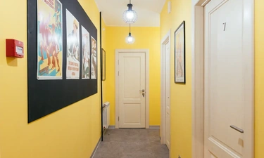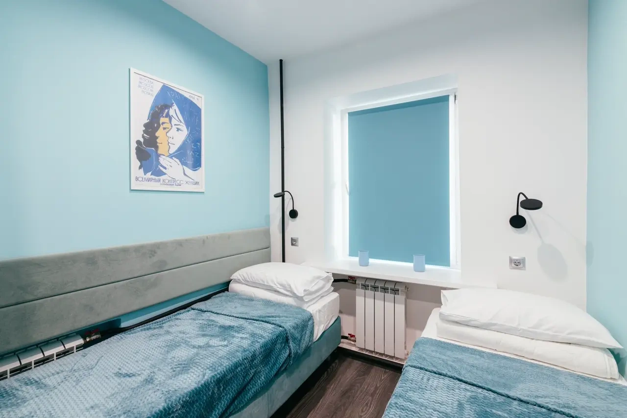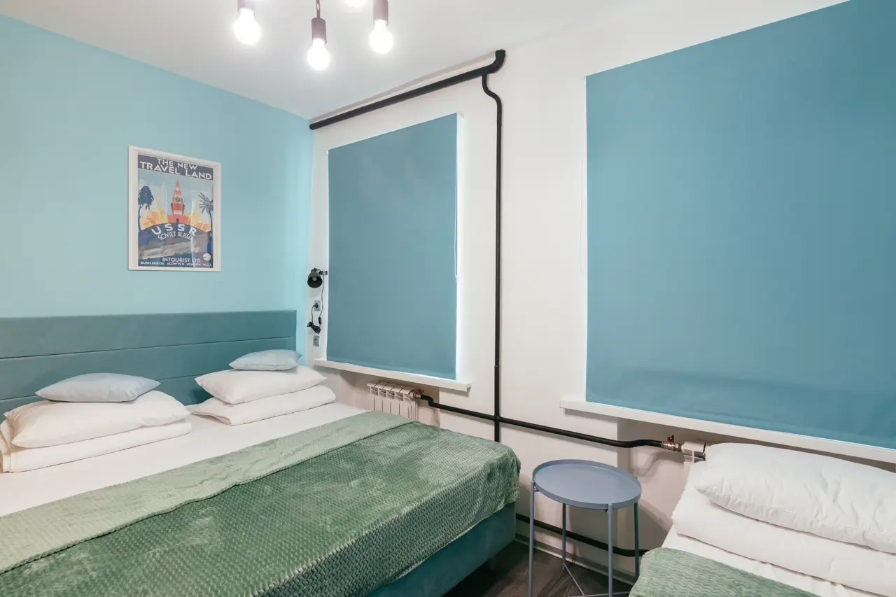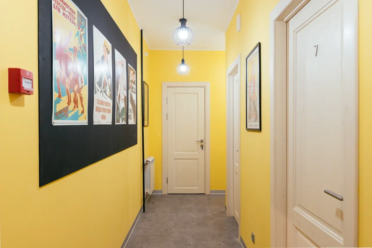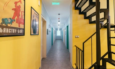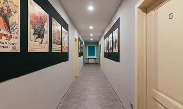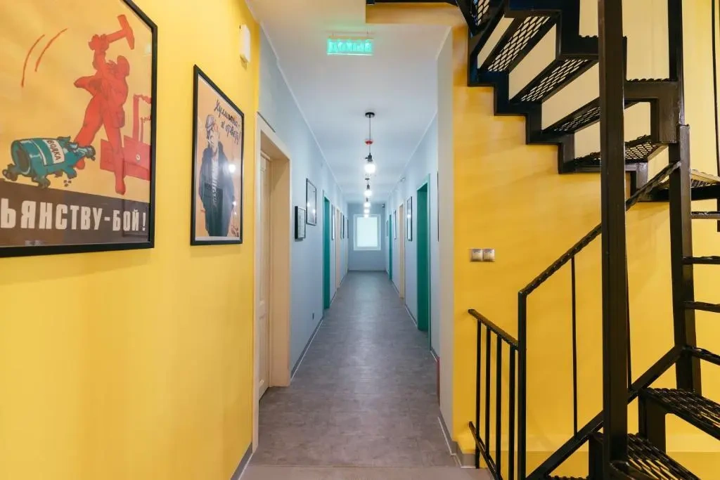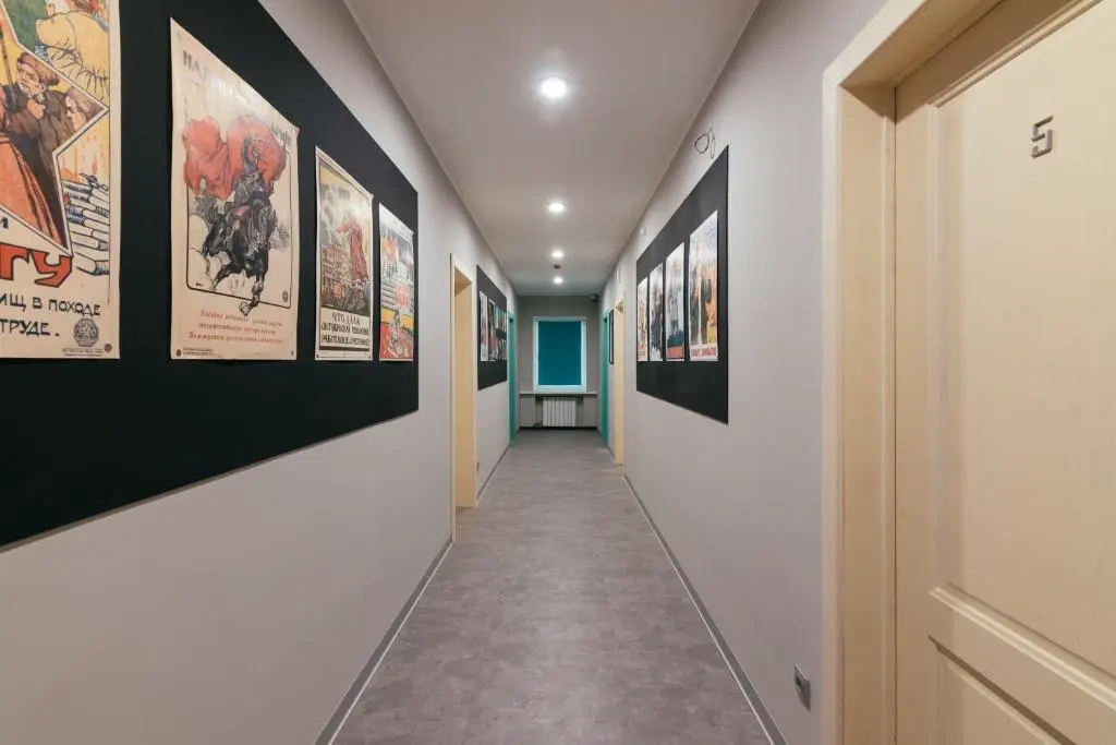 Сам отель выполнен в стиле СССР, на стенах много плакатов советского времени.