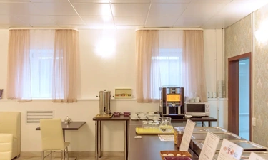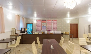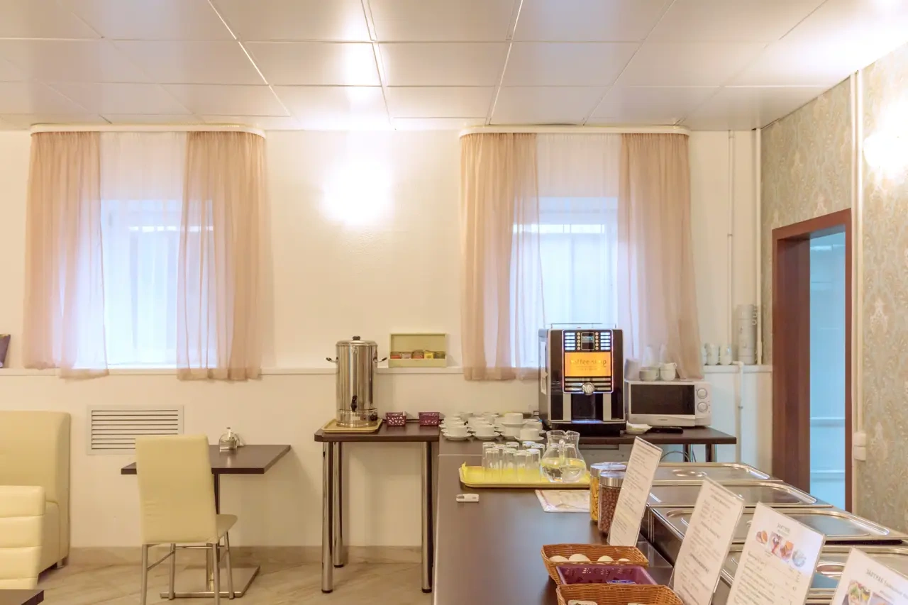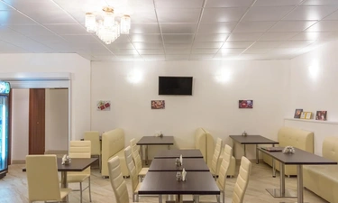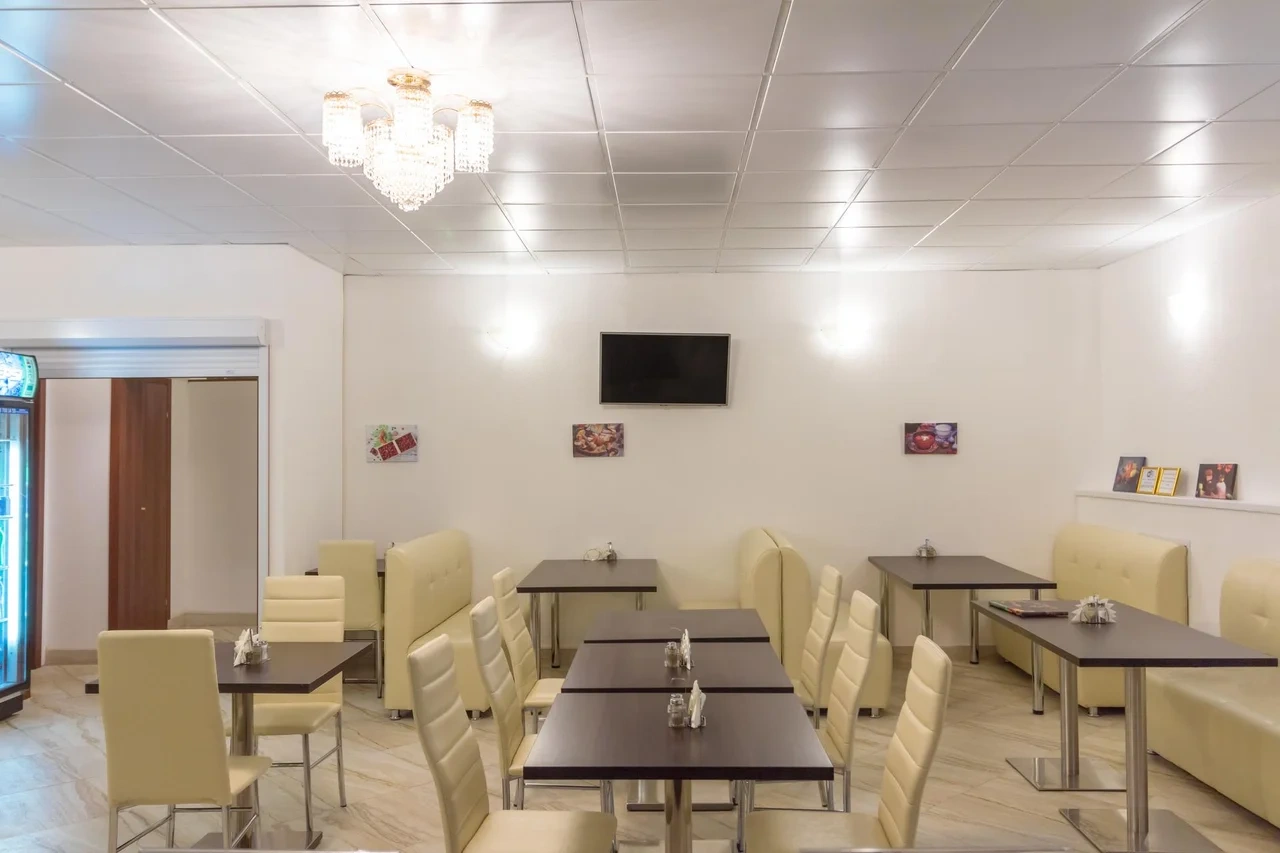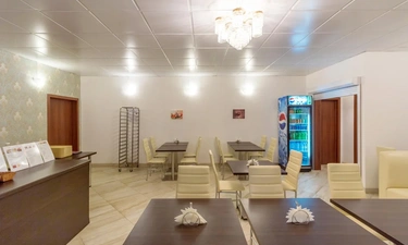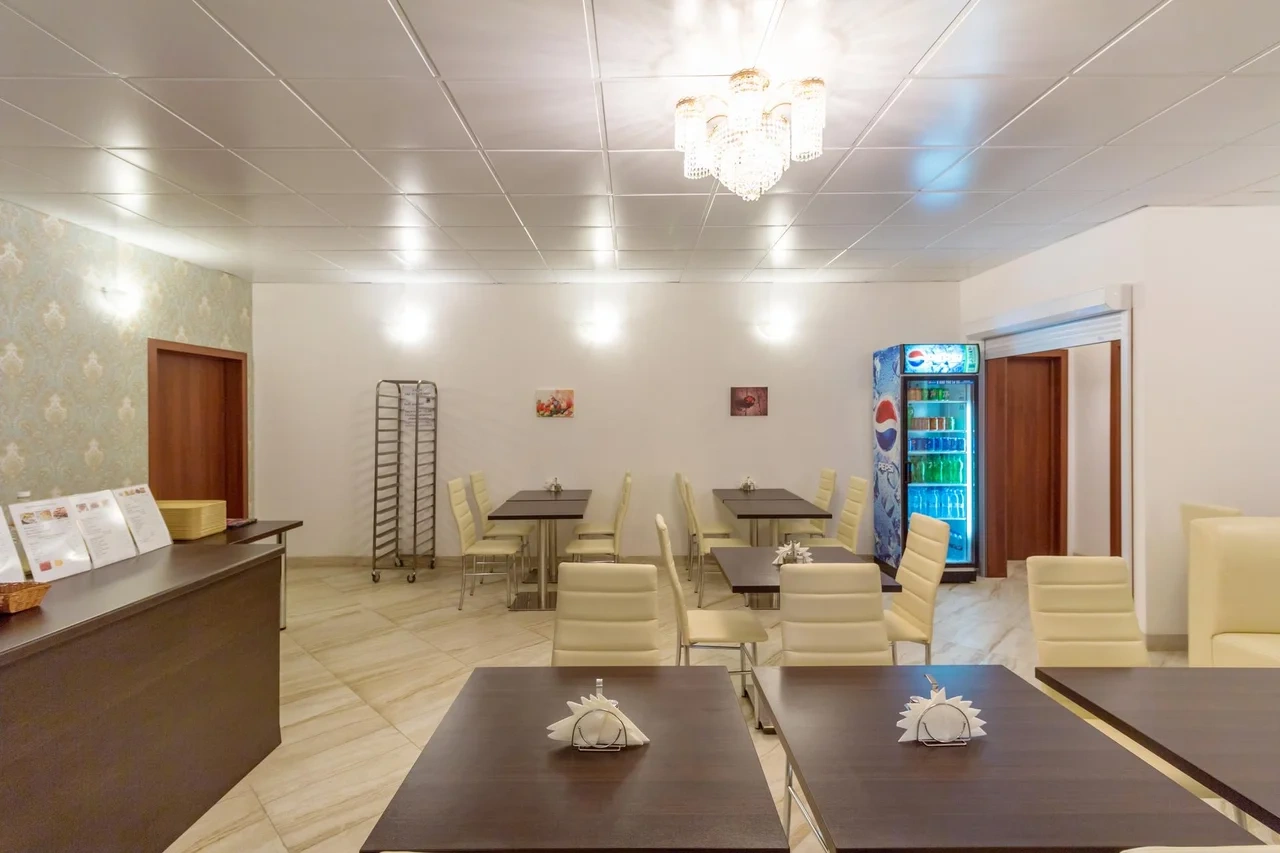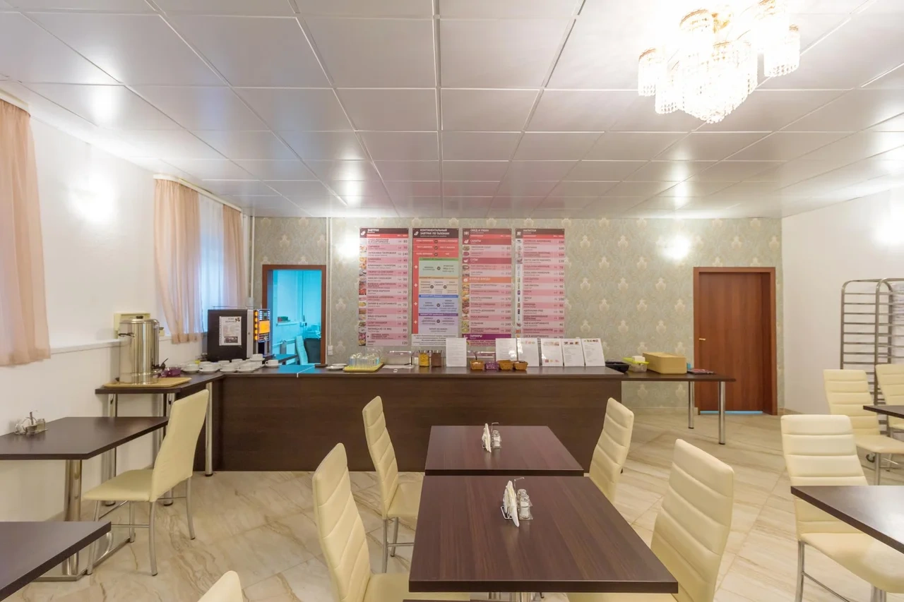 В кафе «Рябина» подают блюда русской и европейской кухни. Стойка регистрации работает круглосуточно.