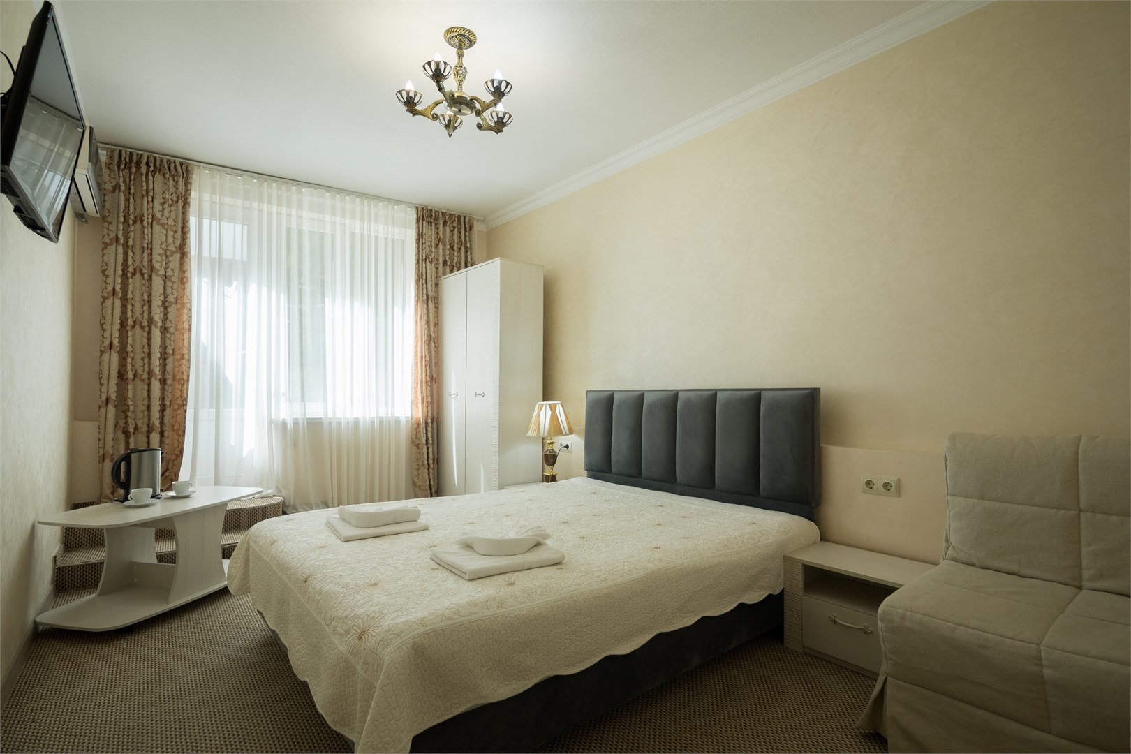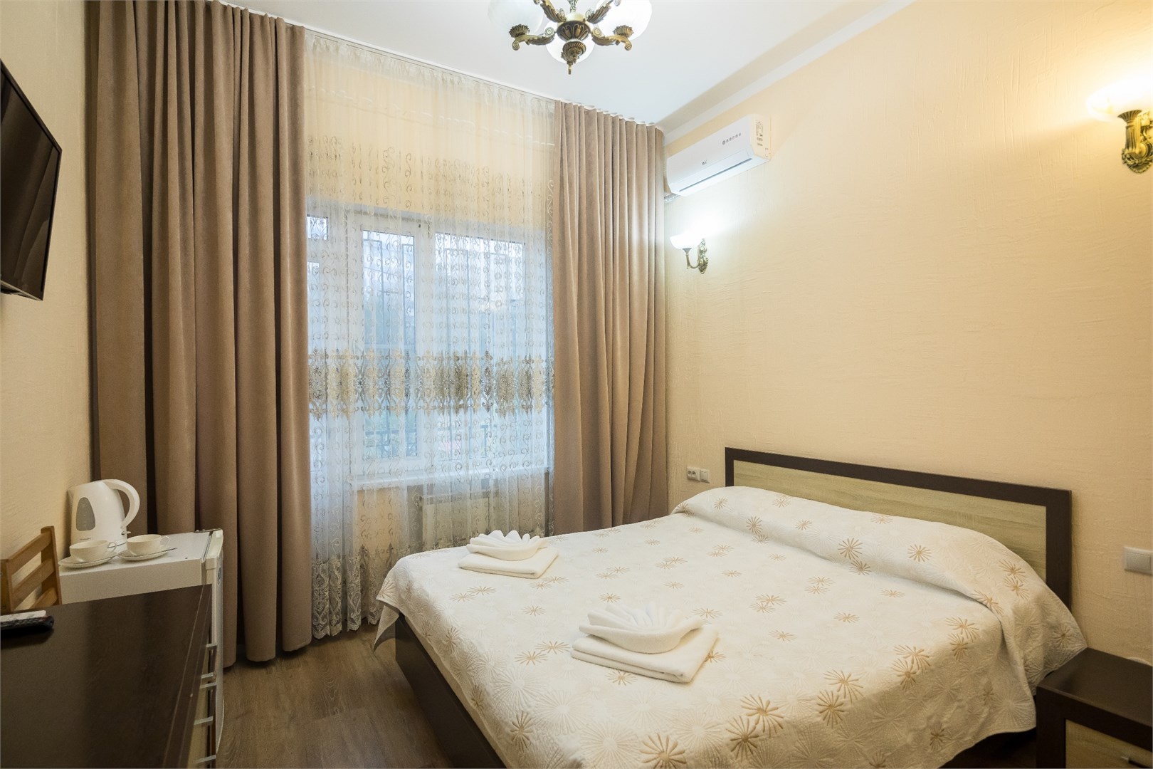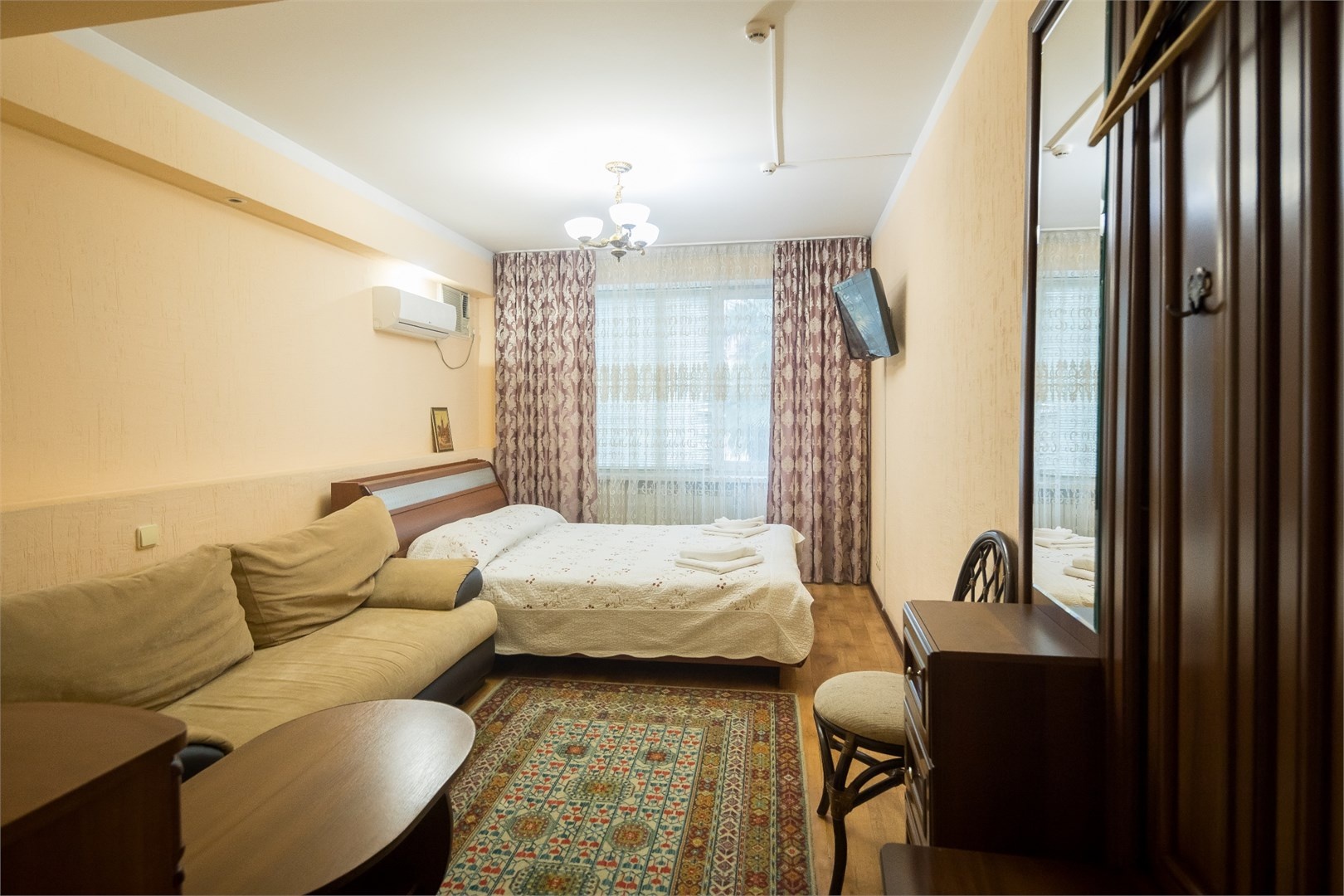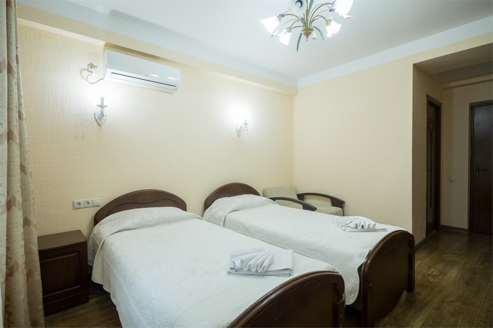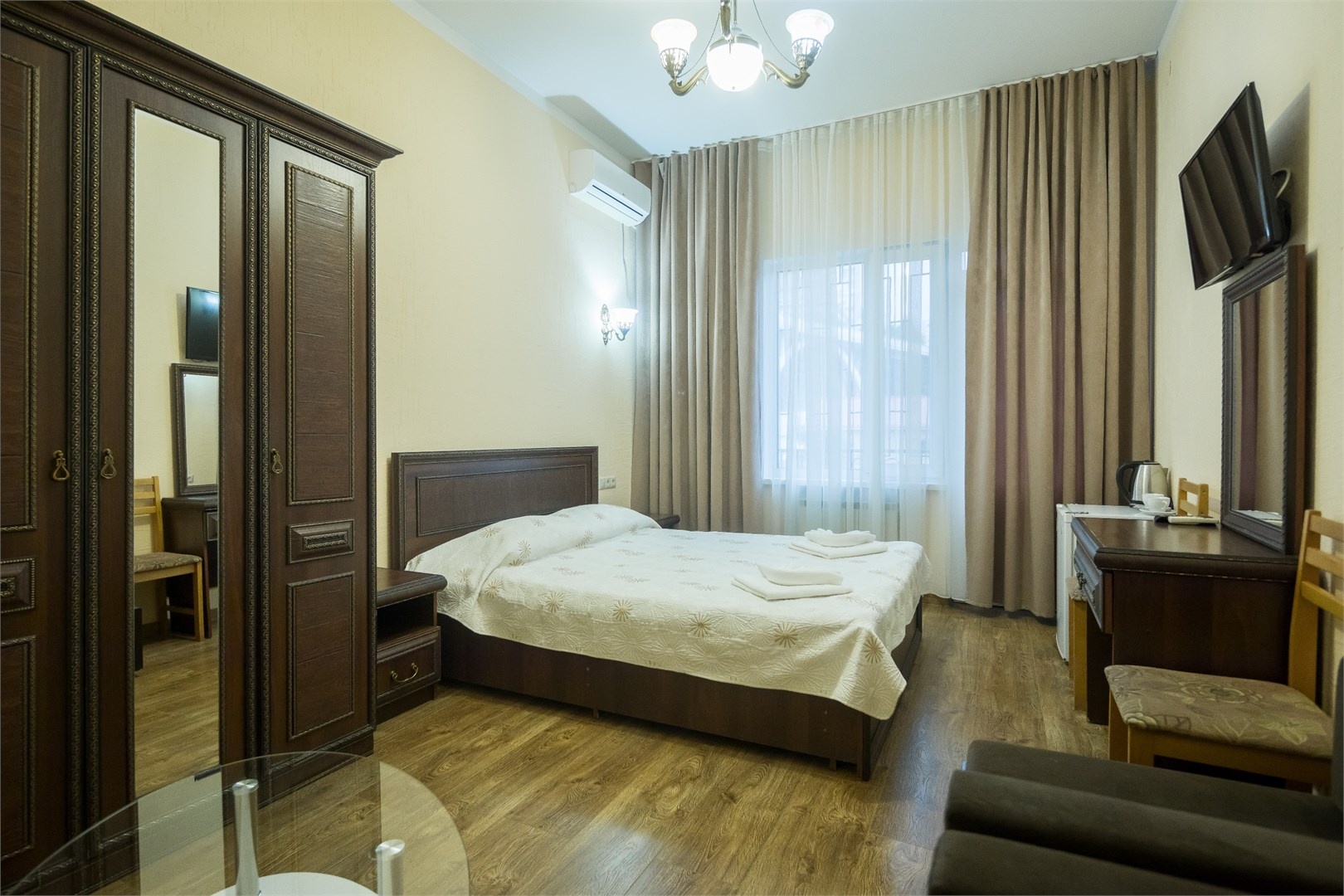 Все номера оборудованы удобными кроватями, сплит-системами, современными ТВ с плоским экраном, холодильниками, вместительными шкафами для одежды. В отдельных номерах есть мягкая мебель, сейфы для ценных вещей и балконы. В каждом номере индивидуальная ванная комната с набором полотенец, гигиенических принадлежностей, санузлом, раковиной и феном.