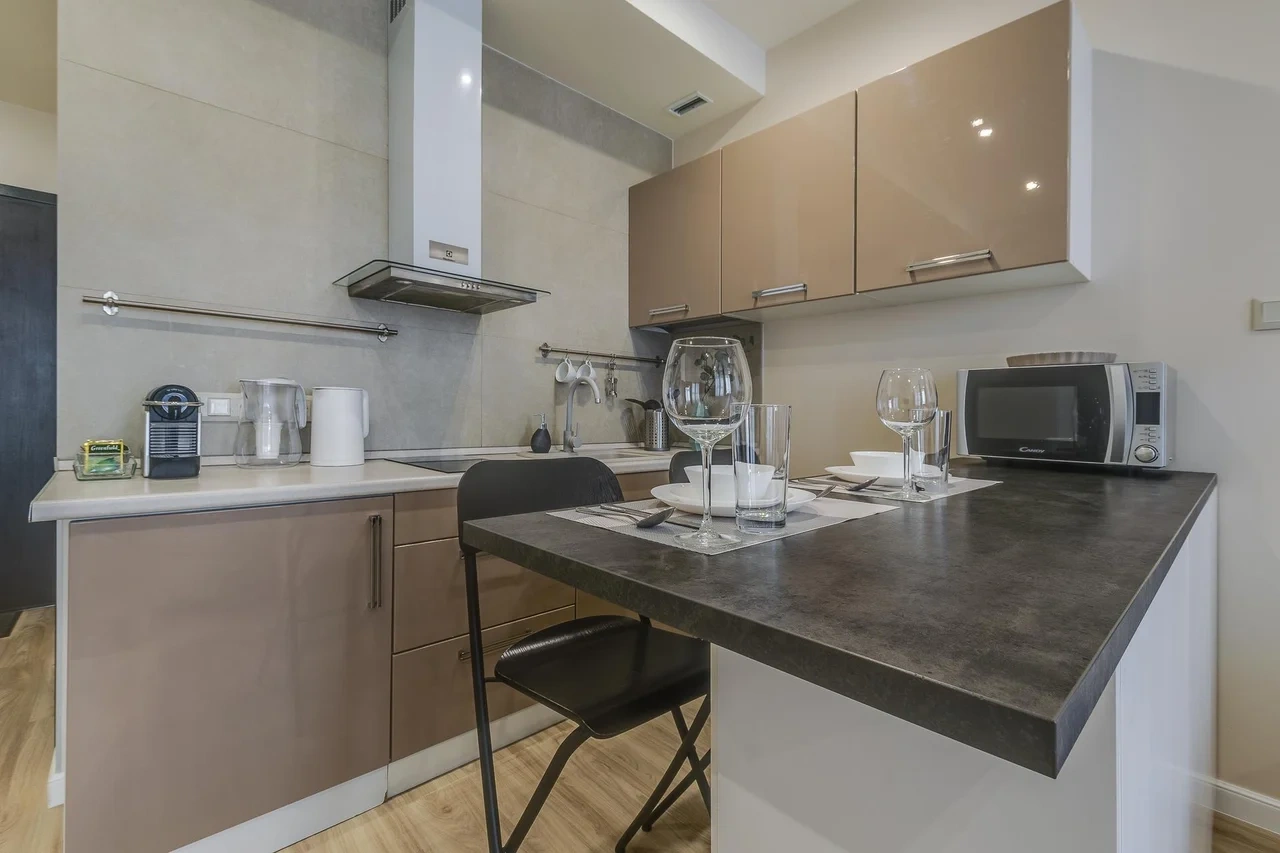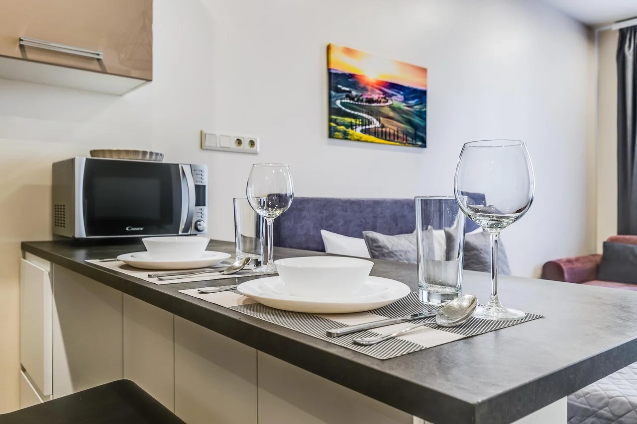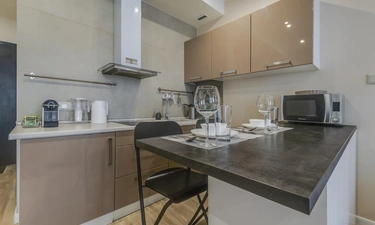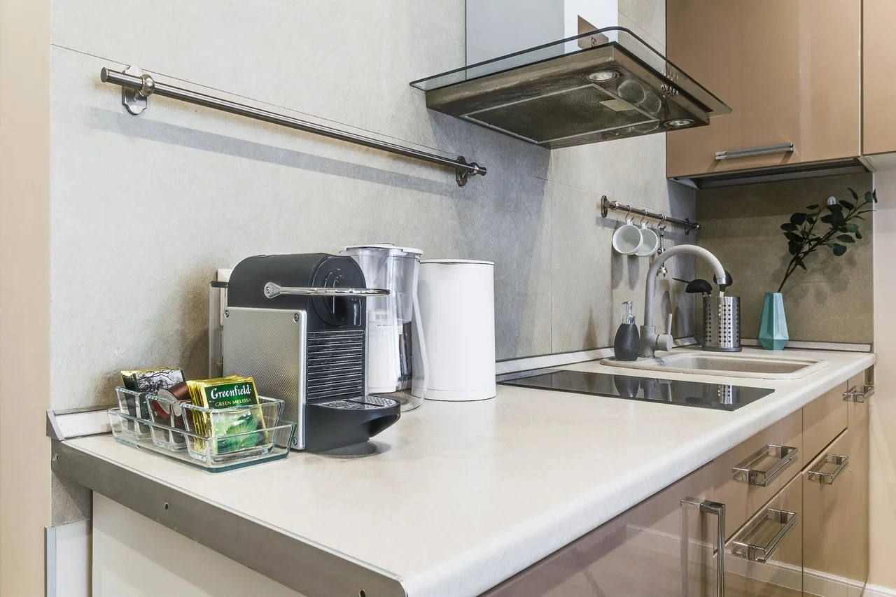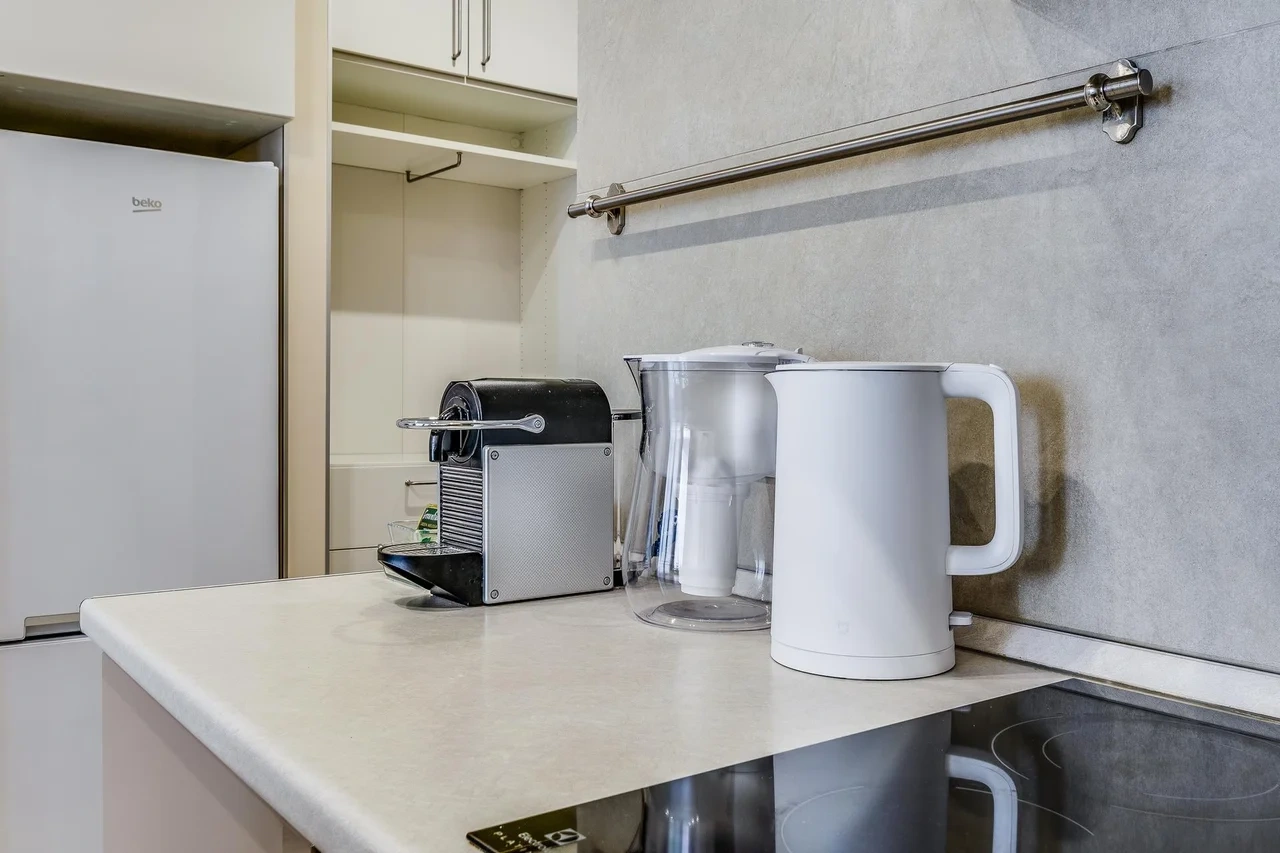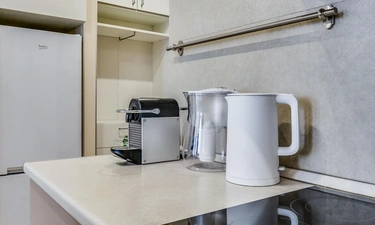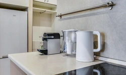 - в зоне кухни: кофемашина Nespresso, посудомоечная машина, электрочайник, вытяжка, посуда для приготовления и приема пищи, чай, кофе, сахар, соль;