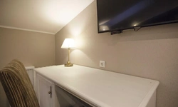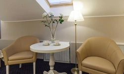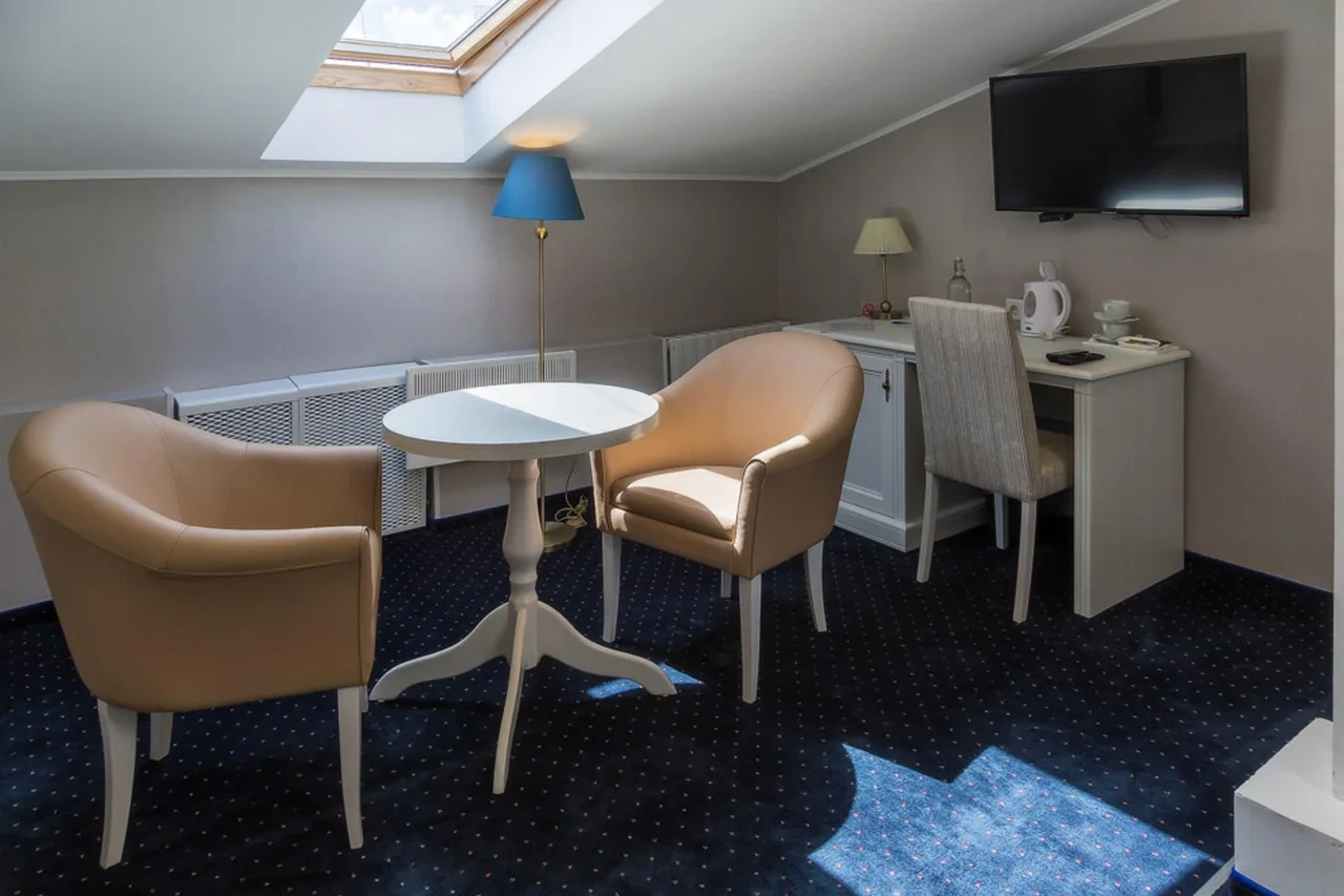 Номер категории Комфорт - стильный интерьер в молочно-бежевых тонах, удобная, мягкая мебель, большая двуспальная кровать и дополнительное спальное место в виде односпальной кровати. Мансардные окна, обеденная зона столик с красивыми и мягкими креслами. Такой вариант хорошо подойдет для пар и семей с детьми или компании друзей из трех человек. В номере имеется: * Большая и удобная кровать для двоих; * Односпальная кровать; * Столик с мягкими креслами; * Телевизор * Wi-Fi * Высокоскоростной интернет; * Душ и санузел с гигиеническими принадлежностями; * Кондиционер со сплит-системой; * Комплекты чистых полотенец; * Тапочки; * Фен; * Холодильник; * Чайник; * Зеркало; * Мансардное окно; * Шкаф