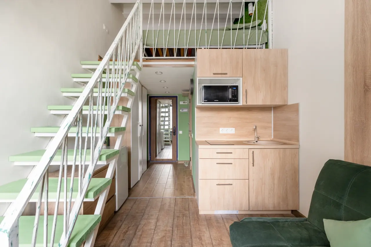 - Кухня с холодильником, плитой, микроволновкой, чайником и посудой