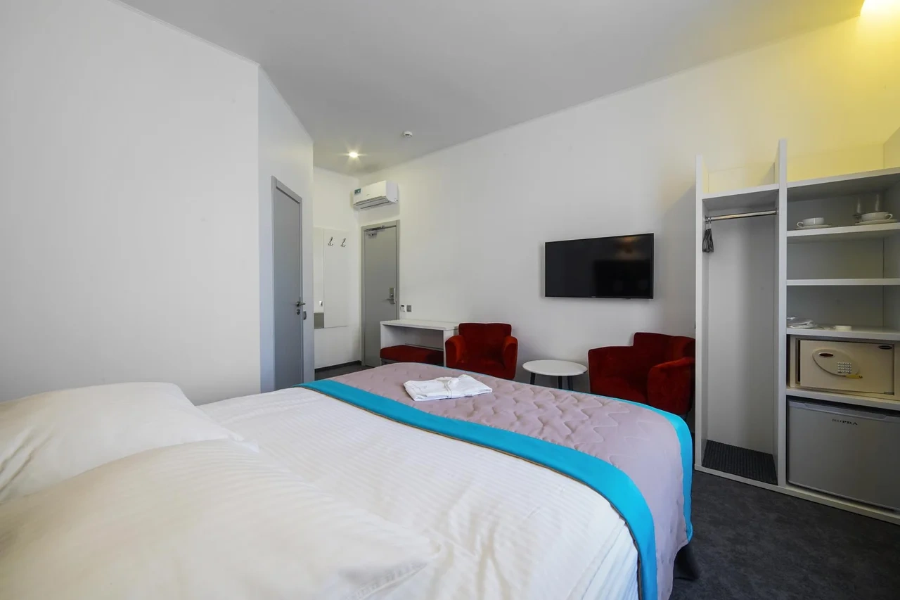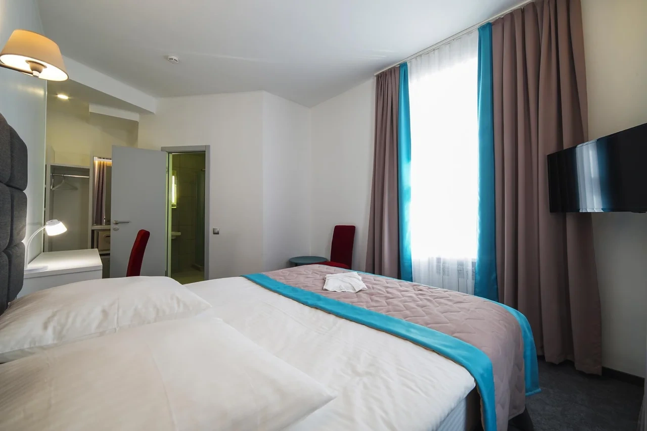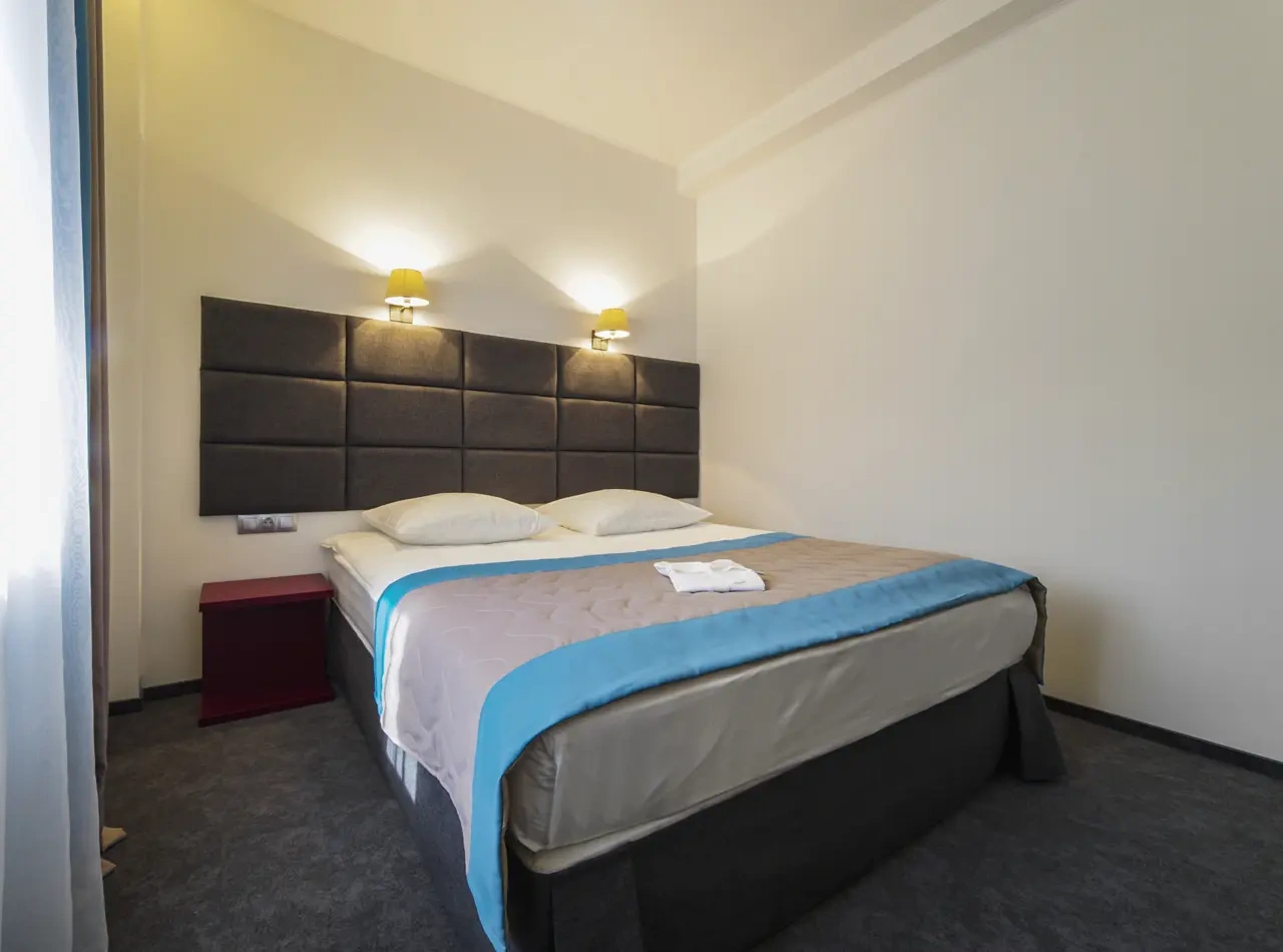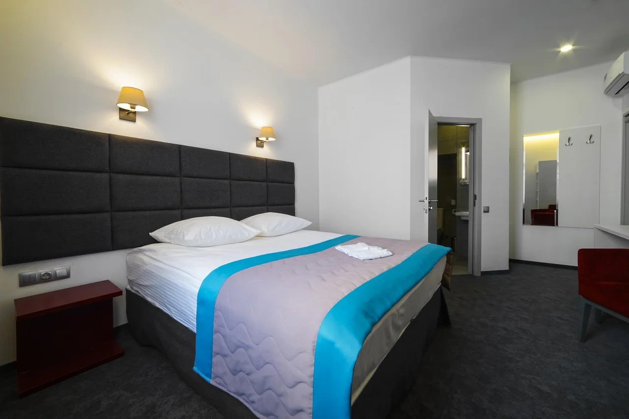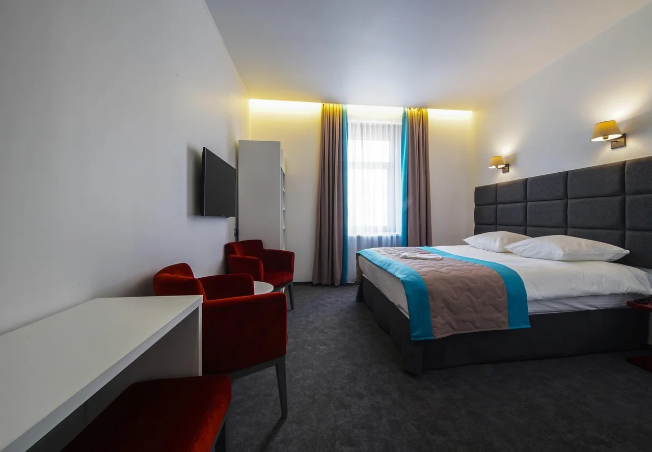 Номера категории "Стандарт" предлагают гостям все необходимое для плодотворной работы и полноценного отдыха. В номере "Стандарт" вы найдете все необходимое для приятного отдыха. Он оборудован удобной кроватью 160 см с мягким матрасом и свежим постельным бельем, где вы сможете отдохнуть после насыщенного дня. В номере также имеется рабочее место с письменным столом и стулом, где вы можете выполнять свои деловые задачи или просто организовать свою работу. Для вашего удобства в номере "Стандарт" есть телевизор с широким выбором каналов, чтобы вы могли насладиться своими любимыми программами или фильмами. Также в номере есть бесплатный Wi-Fi, чтобы вы могли оставаться на связи и пользоваться интернетом без ограничений, мини холодильник и индивидуальный сейф для ценных вещей и документов. В собственной ванной комнате с душем вы найдете все необходимые туалетно-косметические принадлежности, включая полотенца, шампунь, гель для душа, мыло и фен. Номера категории "Стандарт" предлагают пространство, где вы сможете отдохнуть и расслабиться после долгого дня. Они идеально подходят для индивидуальных путешественников или деловых поездок.