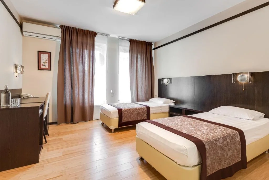 пещера без окна, очень жарко даже с перекрытыми кранами на батарее. слышимость прекрасная, то есть шумоизоляция никакая, слышно какой-то скрип постоянно, поспать нормально не удастся. не проветрить, в ванне сломана пробка слива, в сан.узле маленькая неудобная урна со сломанной педалью, халата нет (хоть и в описании есть), на фене нет насадок, карта размагничивается, на завтрак яичница с 1,5 сосиски, за 4 тысячи можно найти и получше варианты