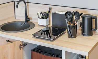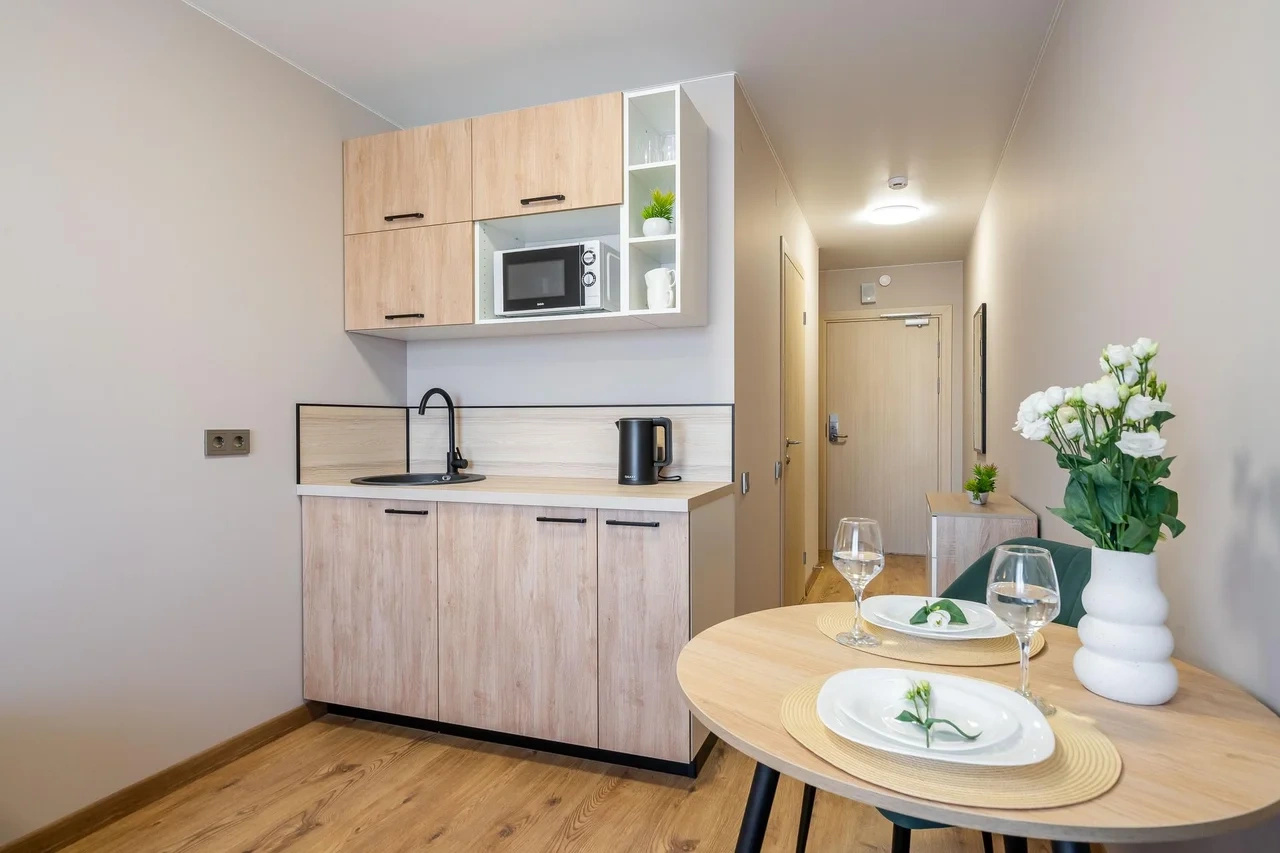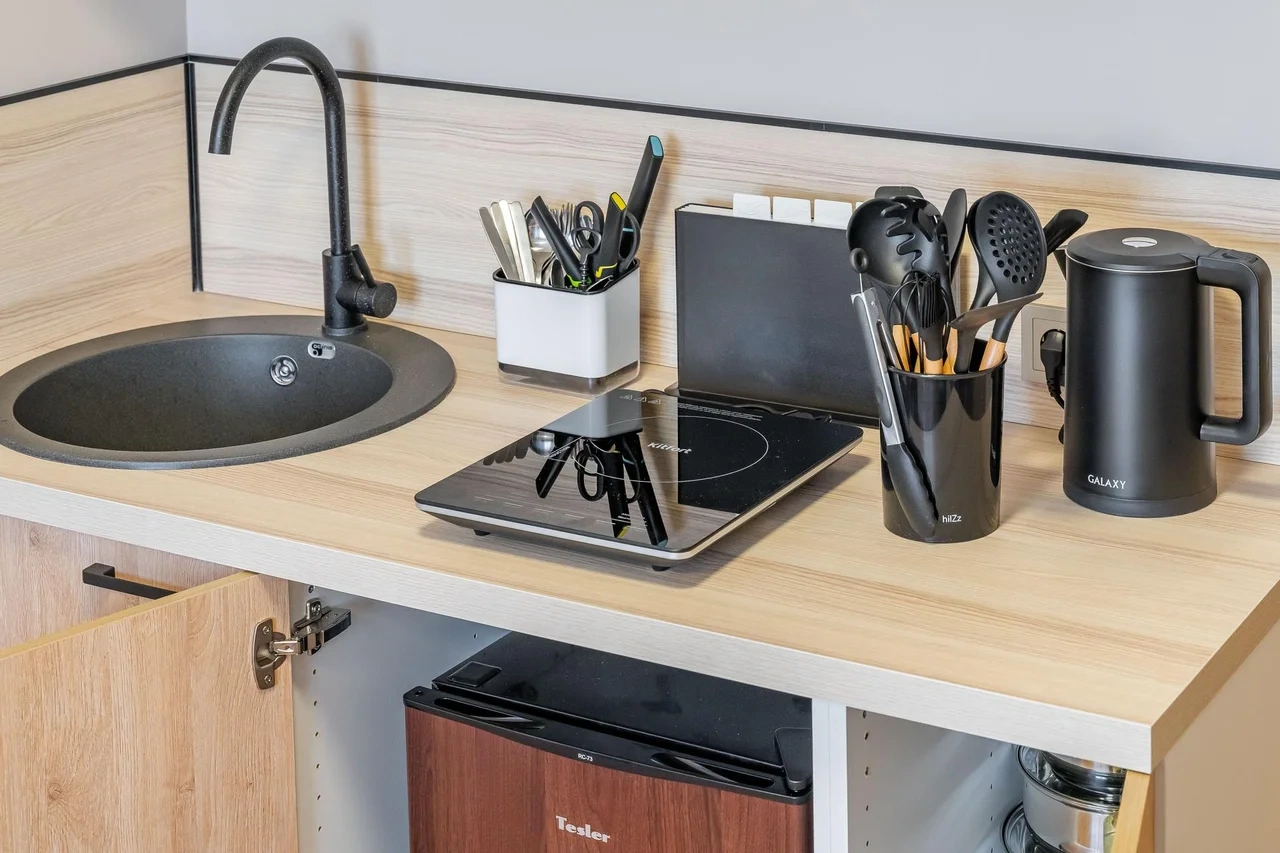 ✅ Кухня со всем необходимым (капсульная кофемашина, холодильник, варочная панель, микроволновая печь, чайник, а так же посуда, приборы и фильтр для питьевой воды)