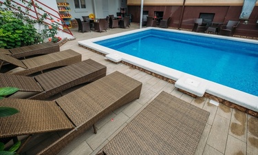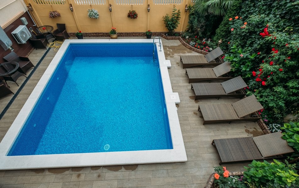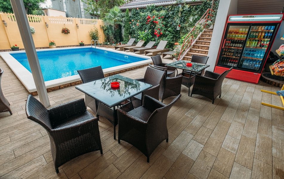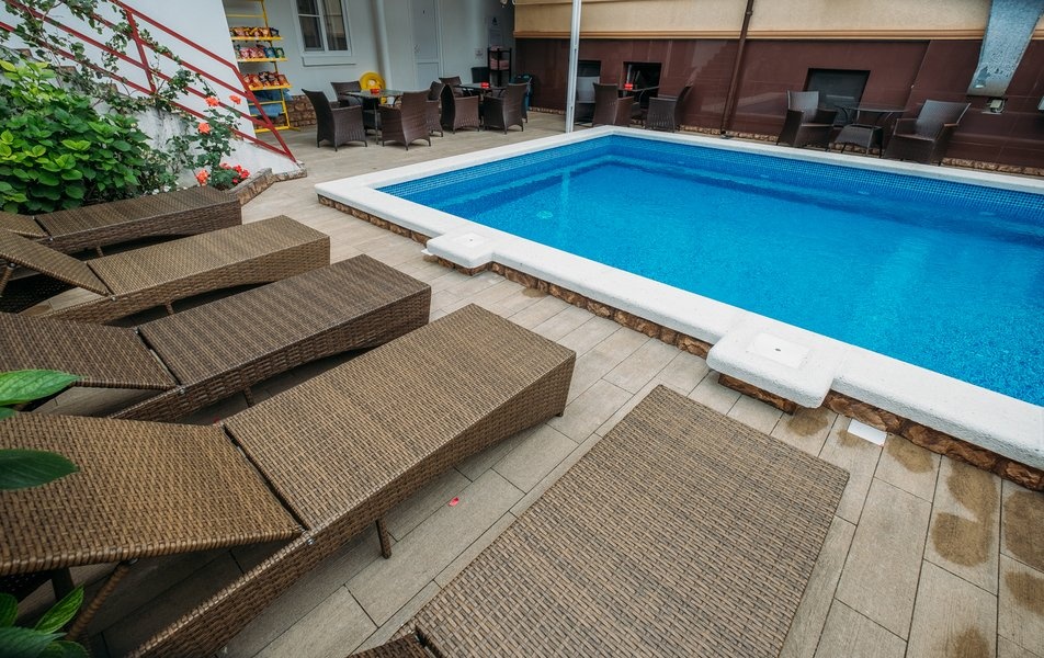 Хороший но не большой бассейн, территория ухожена но двор маленький( впрочем места всем хватоло)