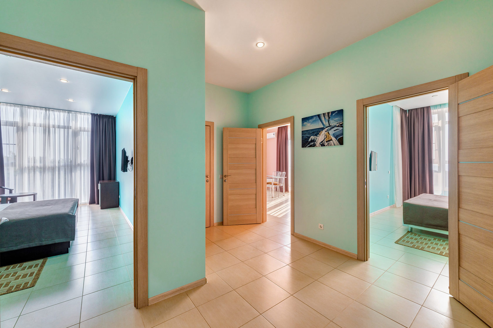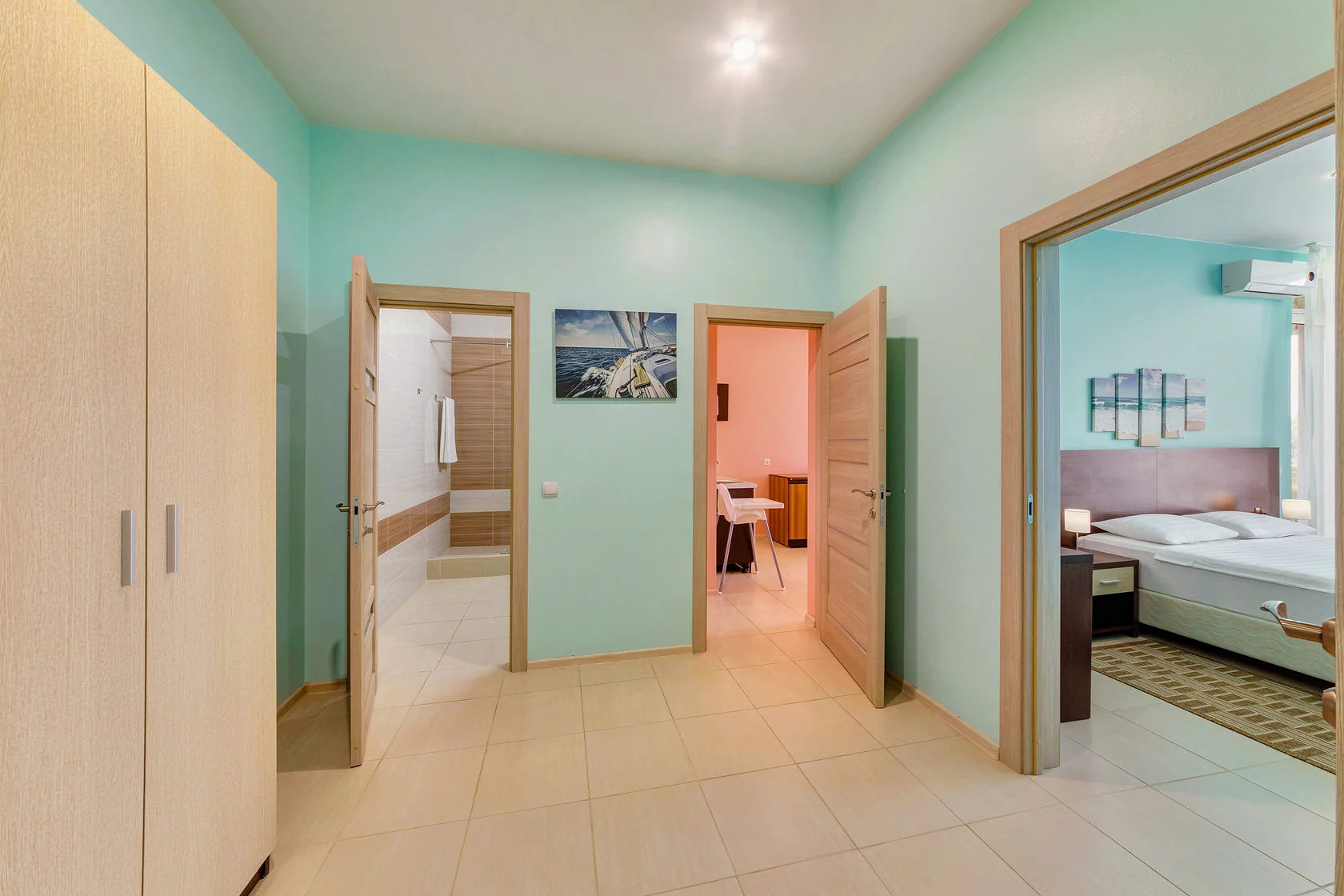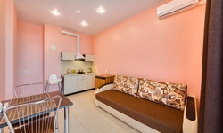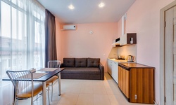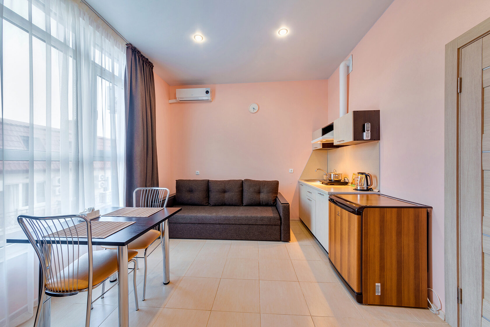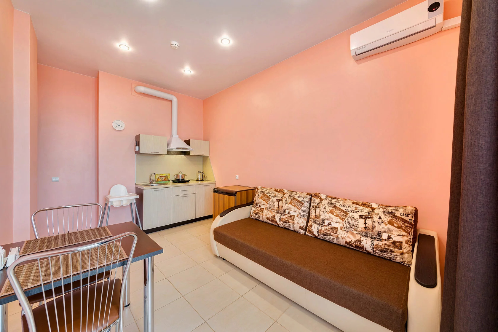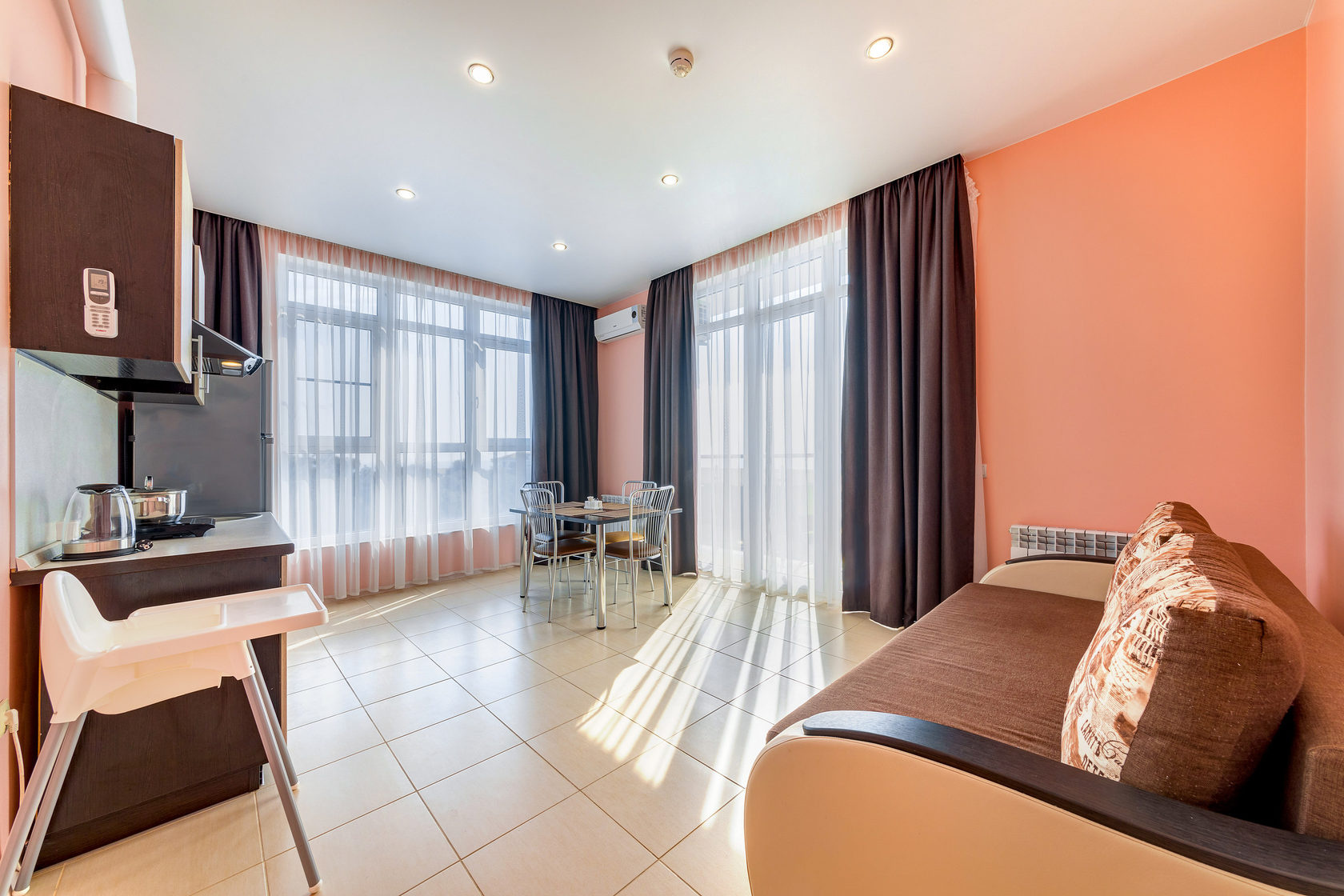 Вас встречают продуманные до мелочей апартаменты для комфортного проживания на морском курорте! Дизайнерские шторы блек-аут позволят Вам даже в самый солнечный день поспать подольше, мини-кухня позволит приготовить авторское блюдо из свежей черноморской рыбы, или диетическую кашку Вашему ребенку. Балкон – насладиться вечерней прохладой и видами моря/горных хребтов. Уложив ребенка спать, Вы можете продолжить вечер в гостиной.