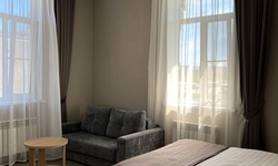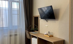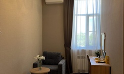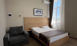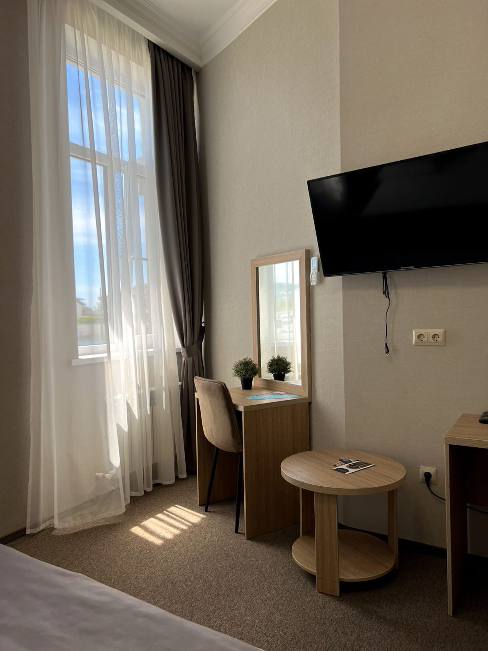 Расположение в районе Высокого берега, очень удачное. Прямо напротив отеля прекрасный парк. Набережная тоже практически в двух шагах, разные кафе с прекрасным видом на море. До пляжа надо вниз спуститься с набережной зигзагом, там большие камни, зато вода чистая, и довольно спокойно и тихо, хотя народу много. Номер просторный, современный, матрас и подушка удобные. Завтрак понравился, выбор хороший. Также заказывала ужин за 500 руб.: салат, горячее и десерт, порции большие, вкусно.