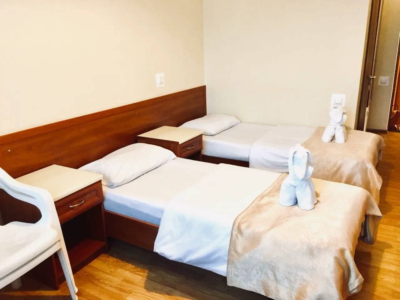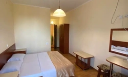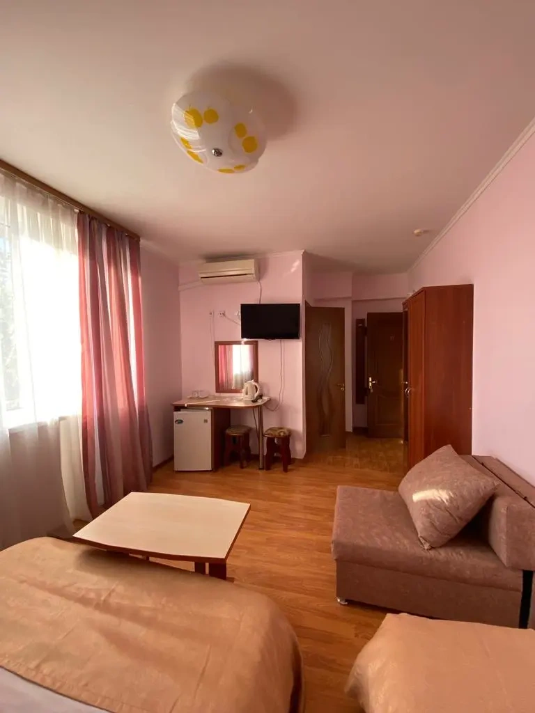 Семейный номер с балконом, размещение до 5-ти человек: Двуспальная кровать + одна односпальная кровать+кресло-кровать; Холодильник; ЖК телевизор; Душ, туалет; Wi-Fi; сплит-система; Чайник, минимальный набор посуды; Сушилка для белья; Балкон с зоной отдыха; Наши номера очень уютные, чистые и полностью укомплектованы для хорошего отдыха! Ждём вас в гости