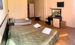 Стандарт 2- х местный, вид на море В номере: 2-х спальная кровать, тумбы, сплит-система, телевизор, мини-холодильник, душевая кабина, унитаз, раковина, стаканы, общая терраса, доп. место - евро раскладушка Квадратура номера - 18 кв. Дети до 5-ти лет принимаются бесплатно без предоставления отдельного спального места и питания. При заселении,НАЛИЧНЫЙ РАСЧЕТ.