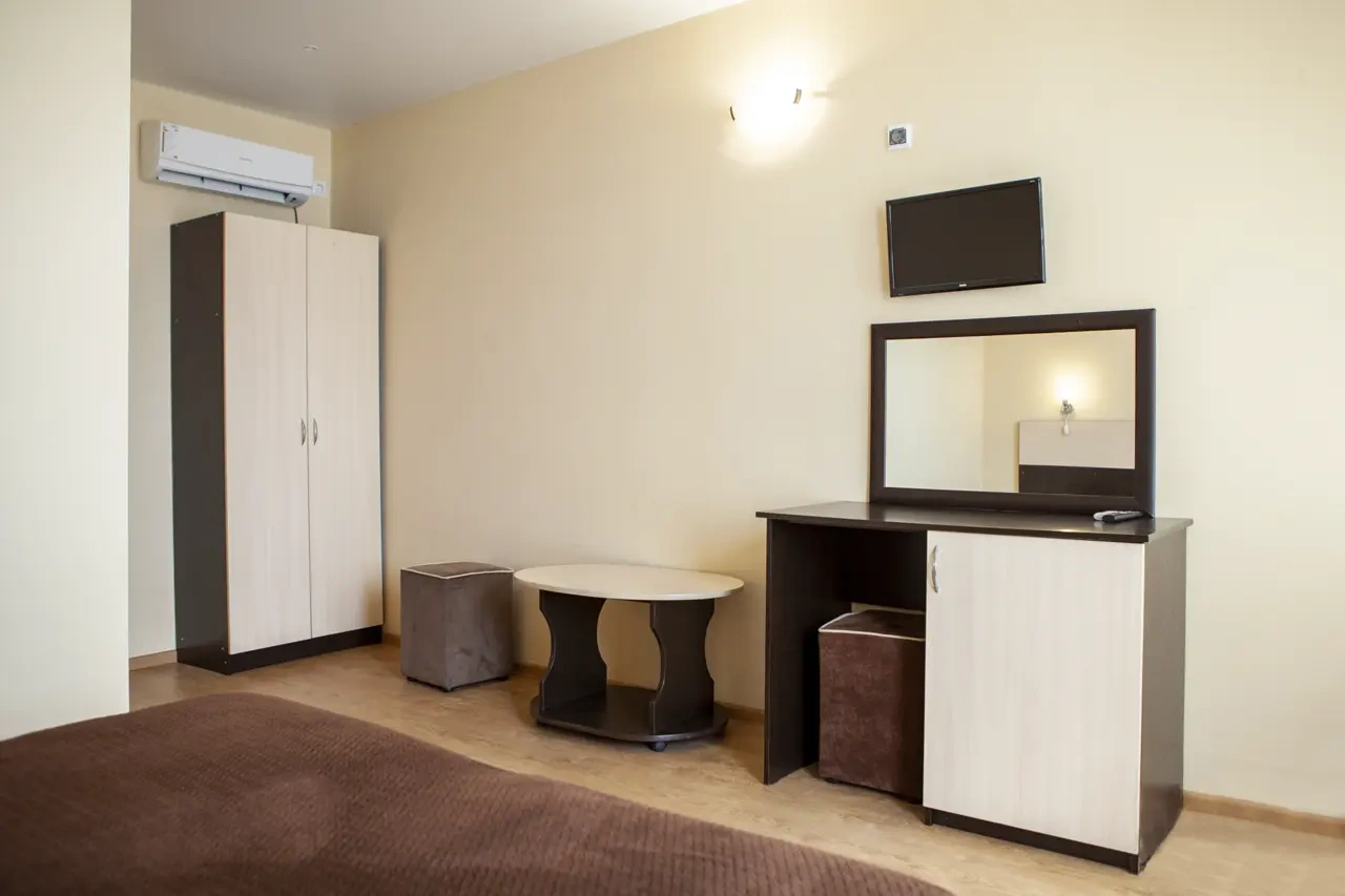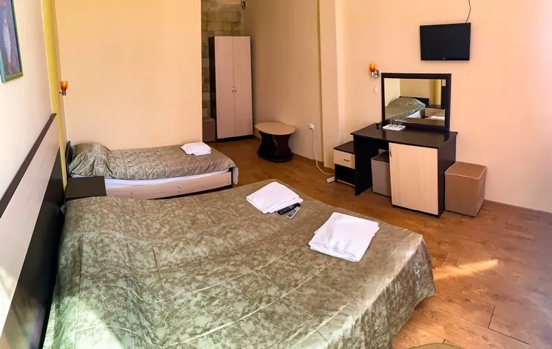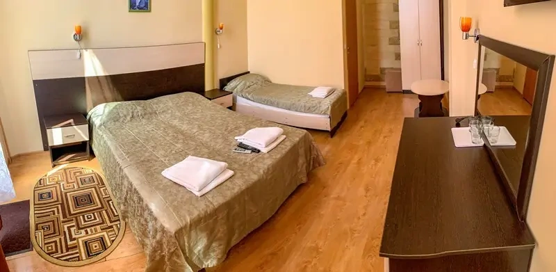 Стандарт 3-х местный, вид на бассейн, 18 кв.м. В номере: 3 полуторные кровати, санузел (душевая кабина, туалет), мини-холодильник, сплит-система, телевизор ЖК, письменный стол, стаканы, детектор задымления, доп. место – евро раскладушка, общая терраса. Дети до 5-ти лет принимаются бесплатно без предоставления отдельного спального места и питания. При заселении,наличный расчет. СЕЗОННАЯ КАТЕГОРИЯ НОМЕРА!
