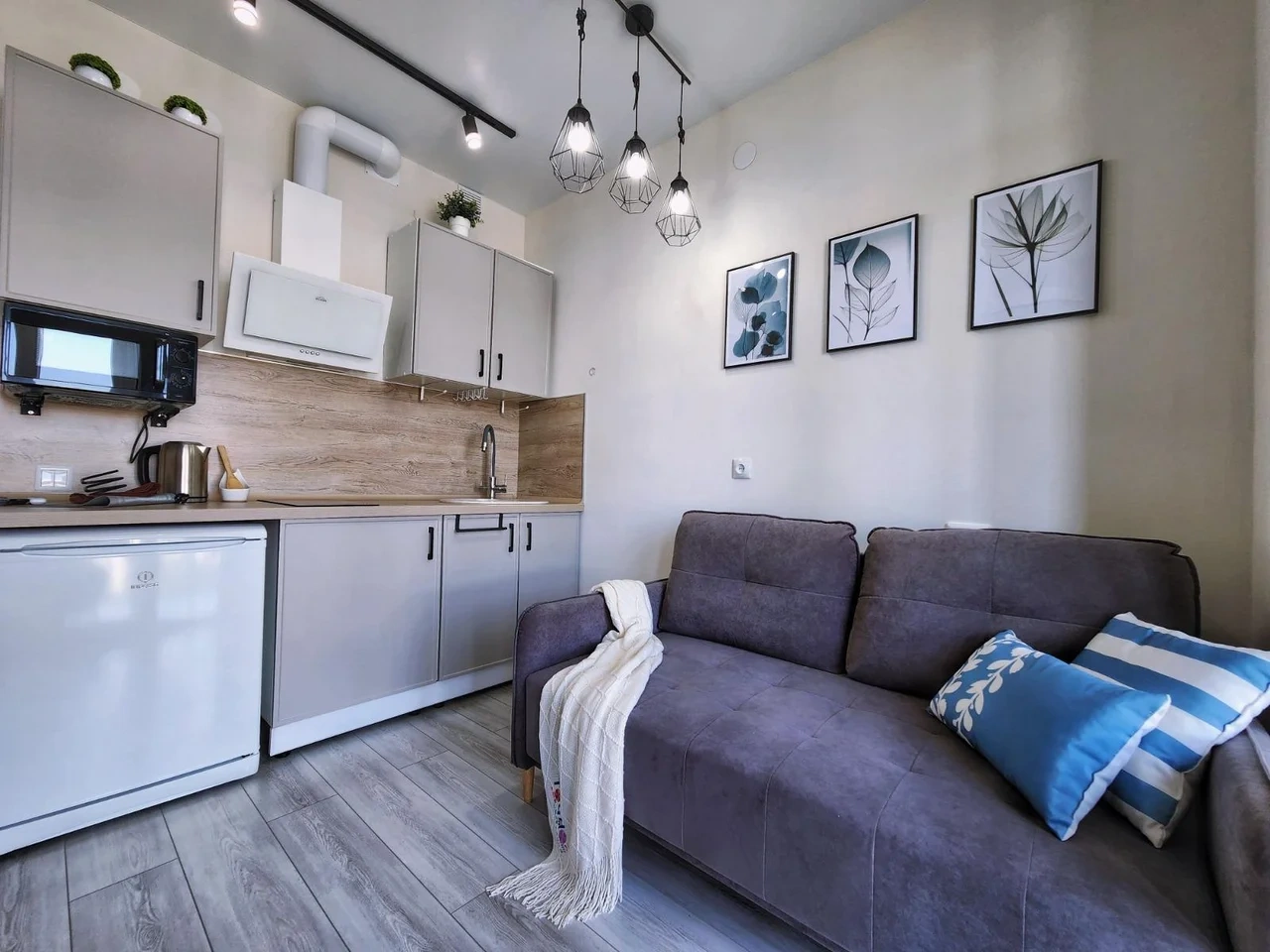 -Оборудованная посудой и техникой кухня, где есть варочная панель, духовой шкаф, холодильник, свч и чайник