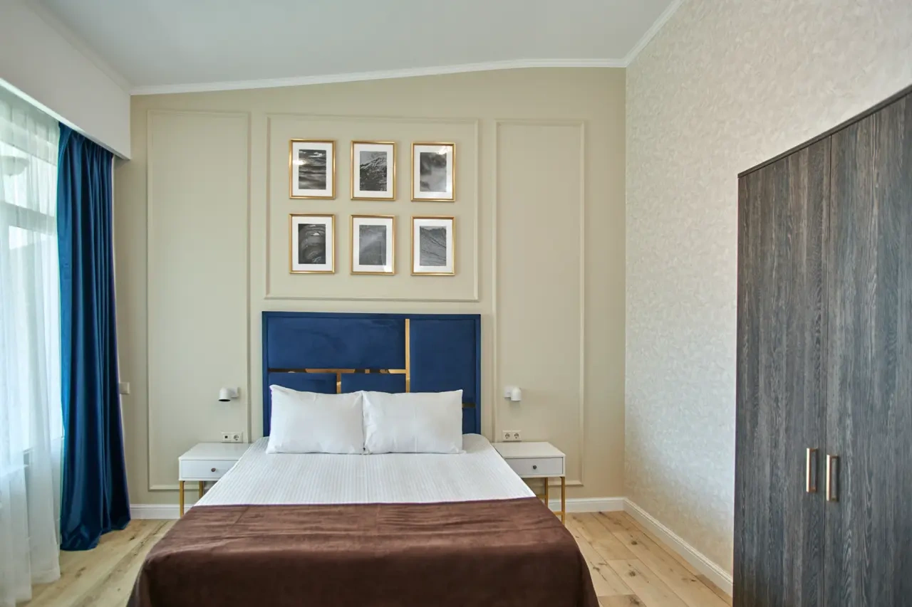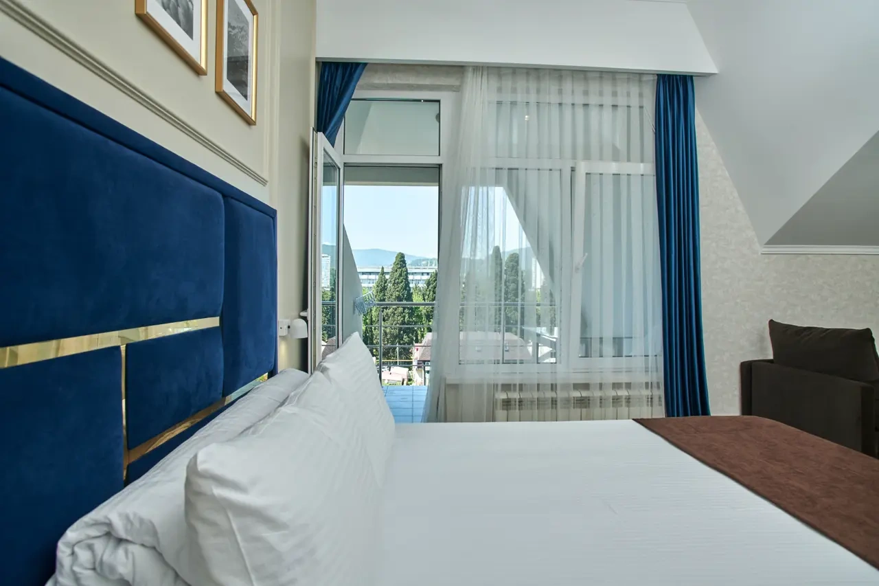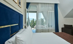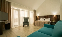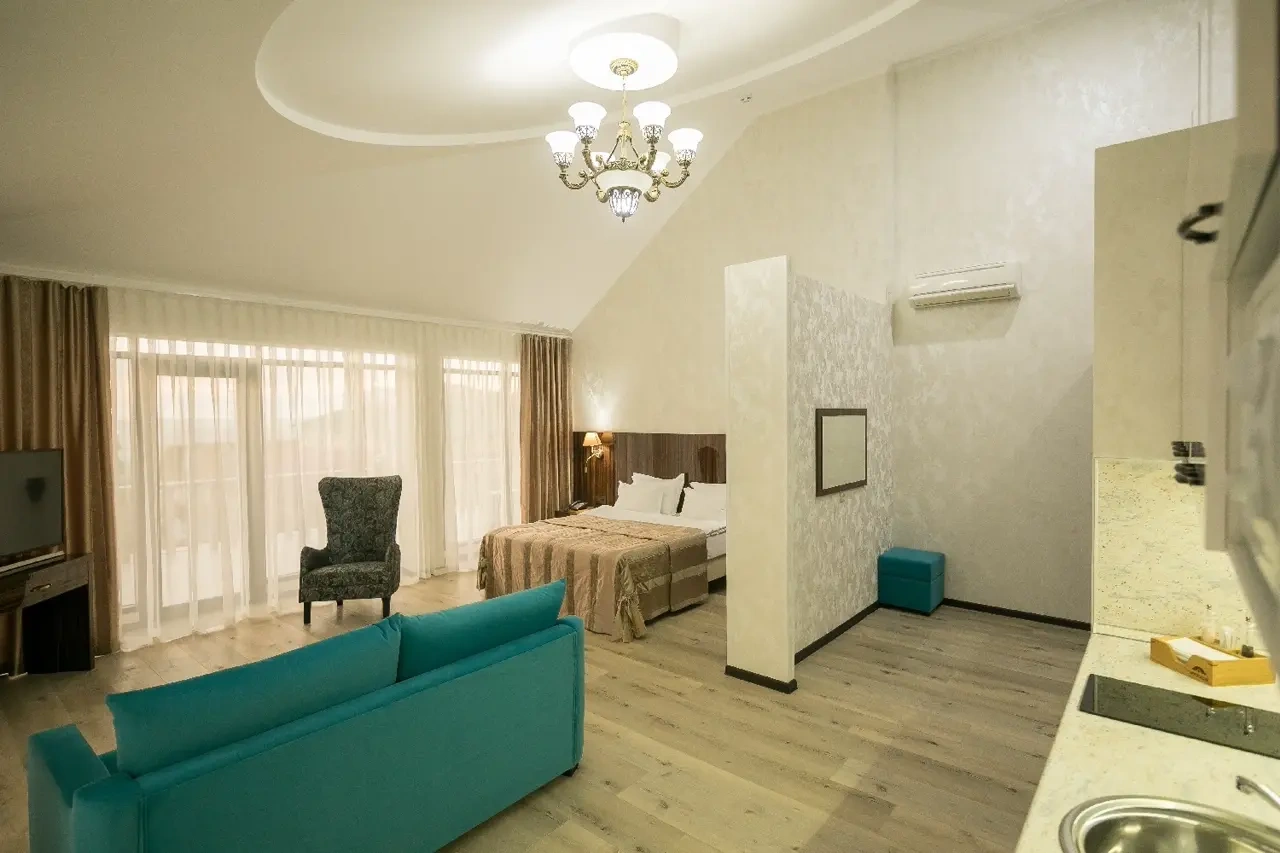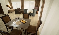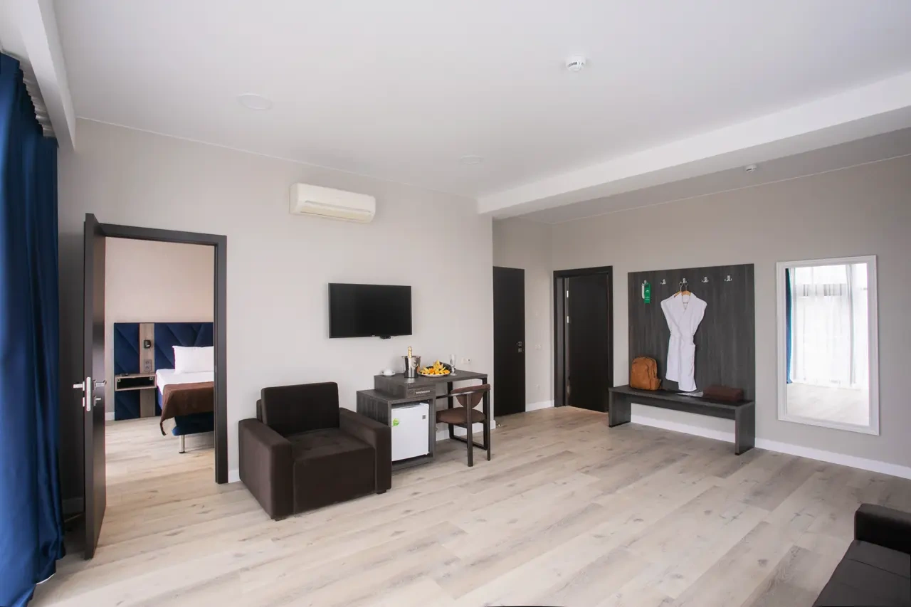 Уютный двухкомнатный номер с двуспальной кроватью гостиной. В номере есть минихолодильник, чайная станция (чай и сахар предоставляются), бутилированная вода, сейф, телевизор. Ванная комната укомплектована косметическими принадлежностями, набором полотенец, халатом и тапочками. Во всех номерах отеля есть балконы. В стоимость включено посещение открытого подогреваемого бассейна, тренажерного зала, сауны и хамам.