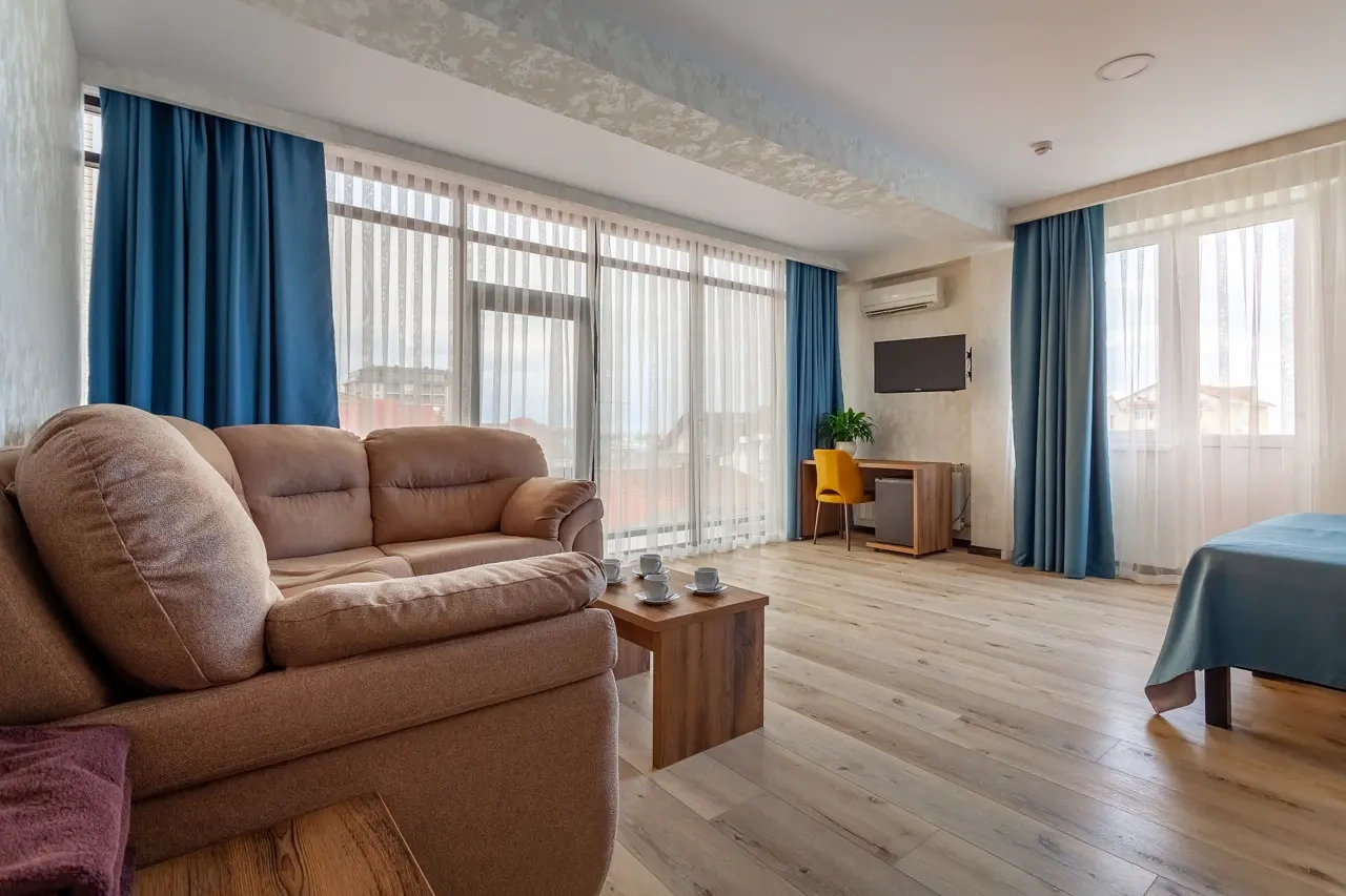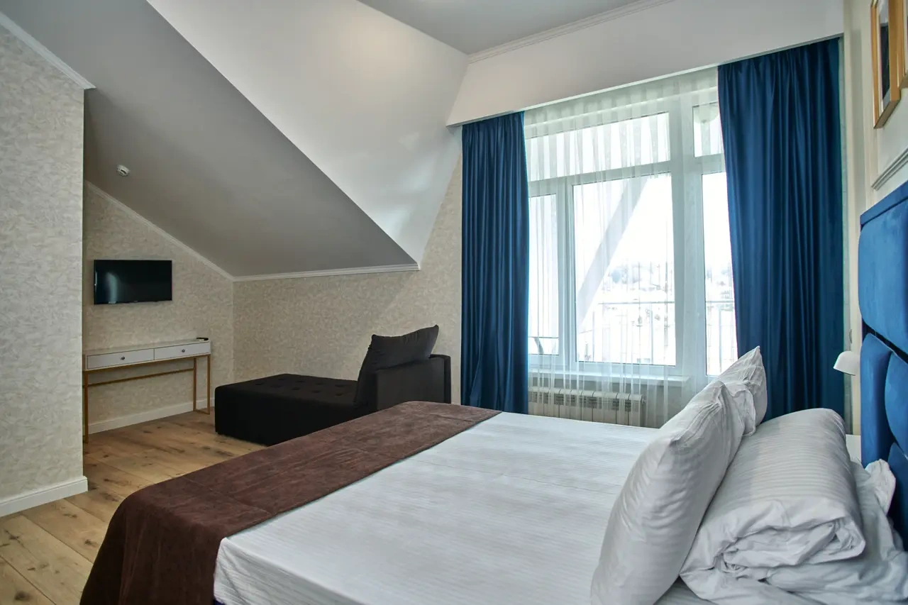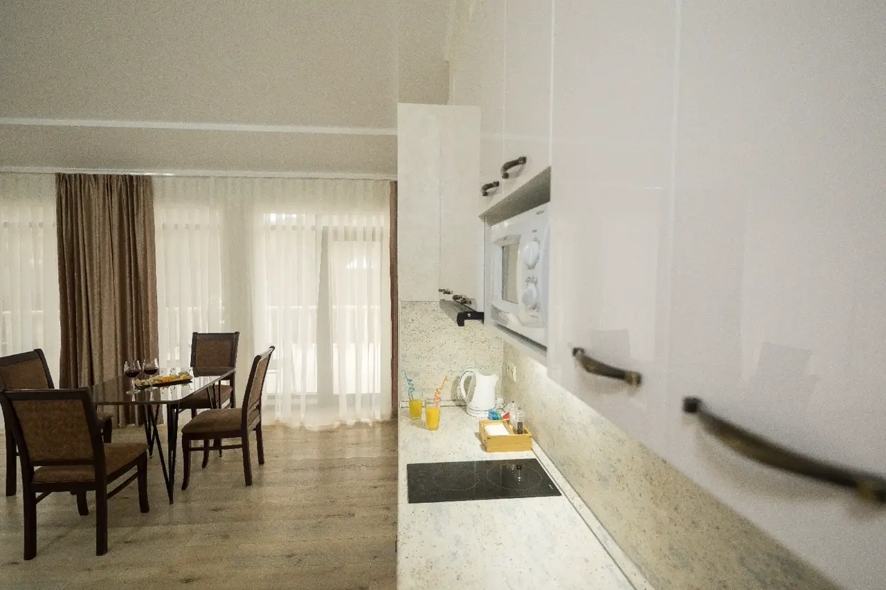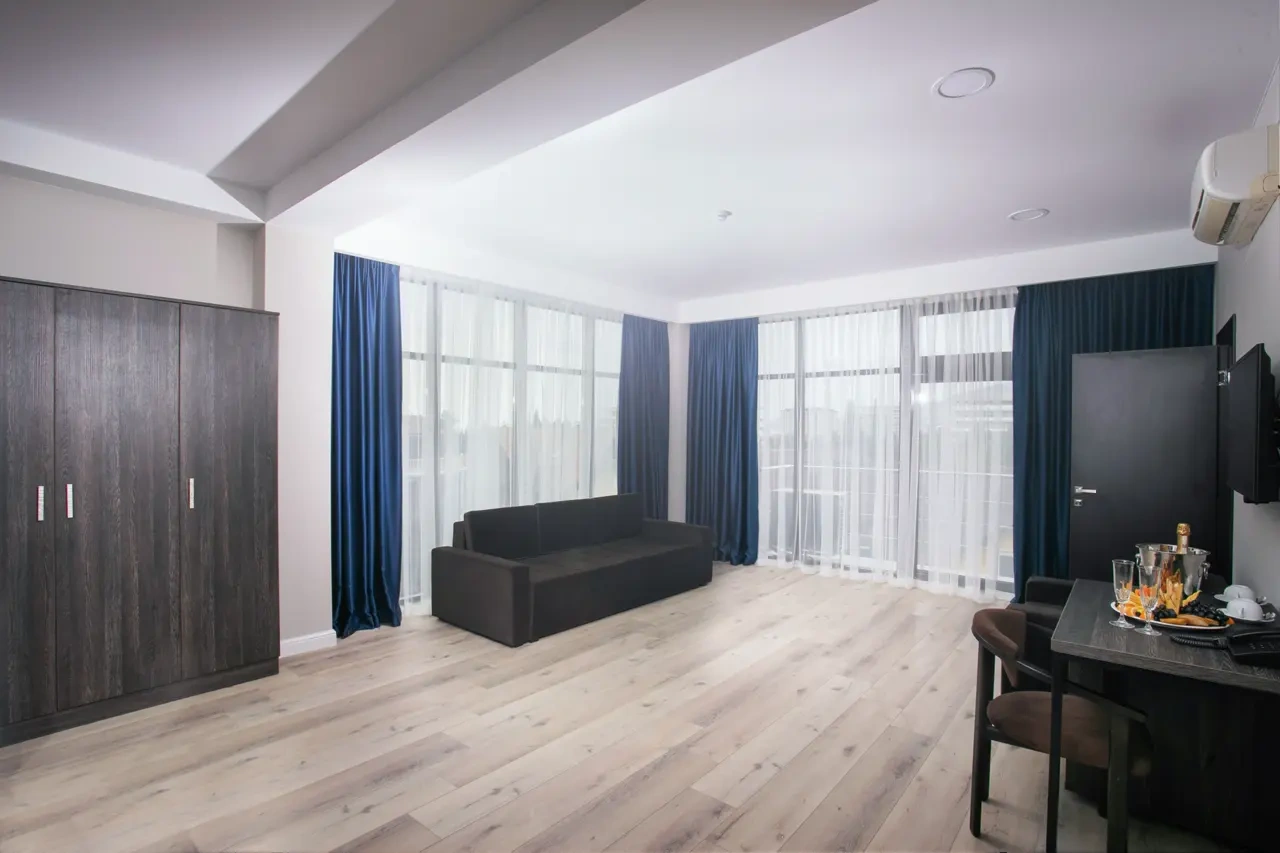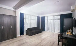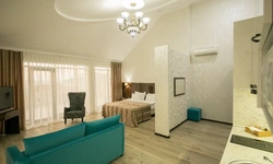 Уютный двухкомнатный номер с двуспальной кроватью гостиной. В номере есть минихолодильник, чайная станция (чай и сахар предоставляются), бутилированная вода, сейф, телевизор. Ванная комната укомплектована косметическими принадлежностями, набором полотенец, халатом и тапочками. Во всех номерах отеля есть балконы. В стоимость включено посещение открытого подогреваемого бассейна, тренажерного зала, сауны и хамам.