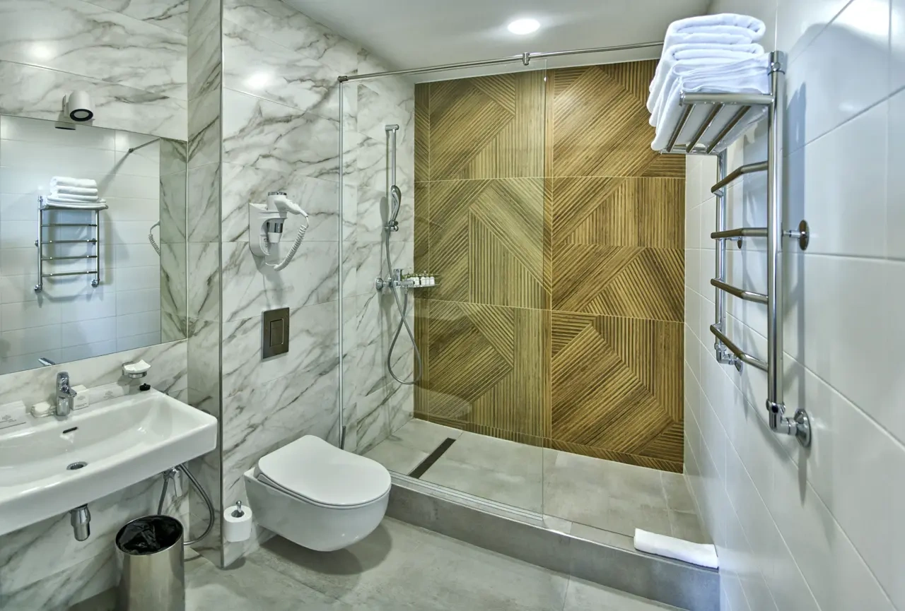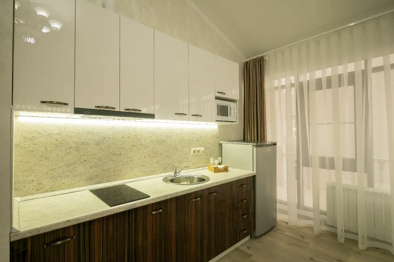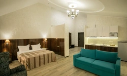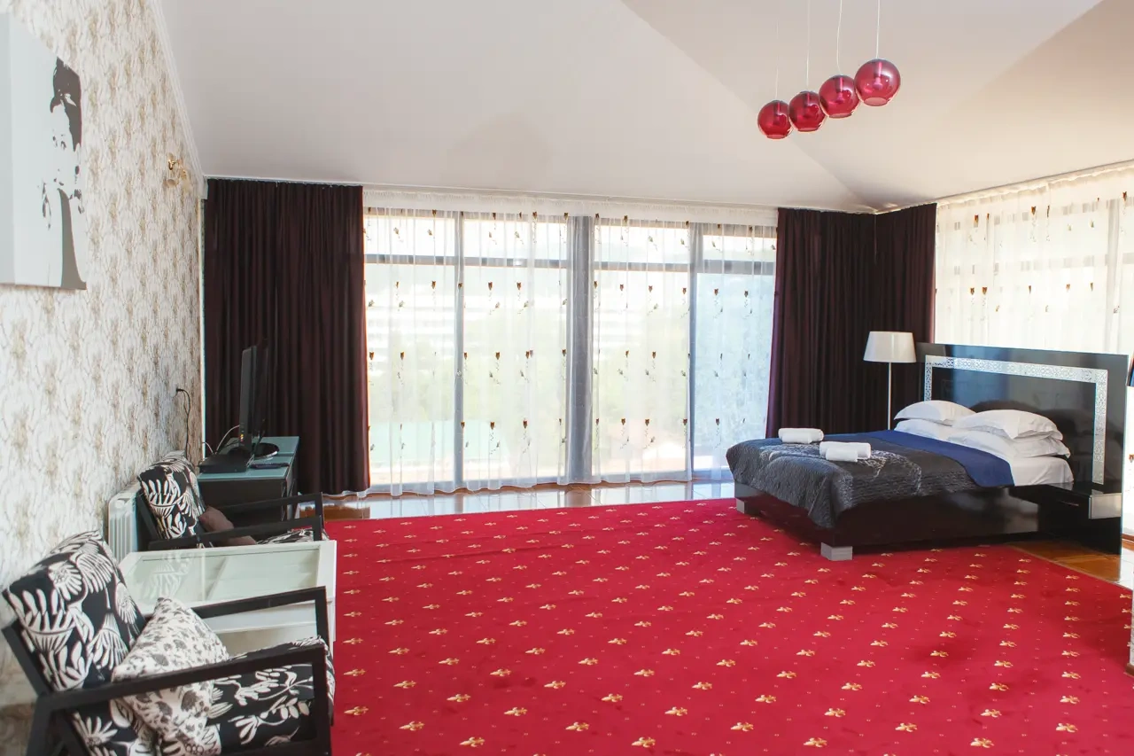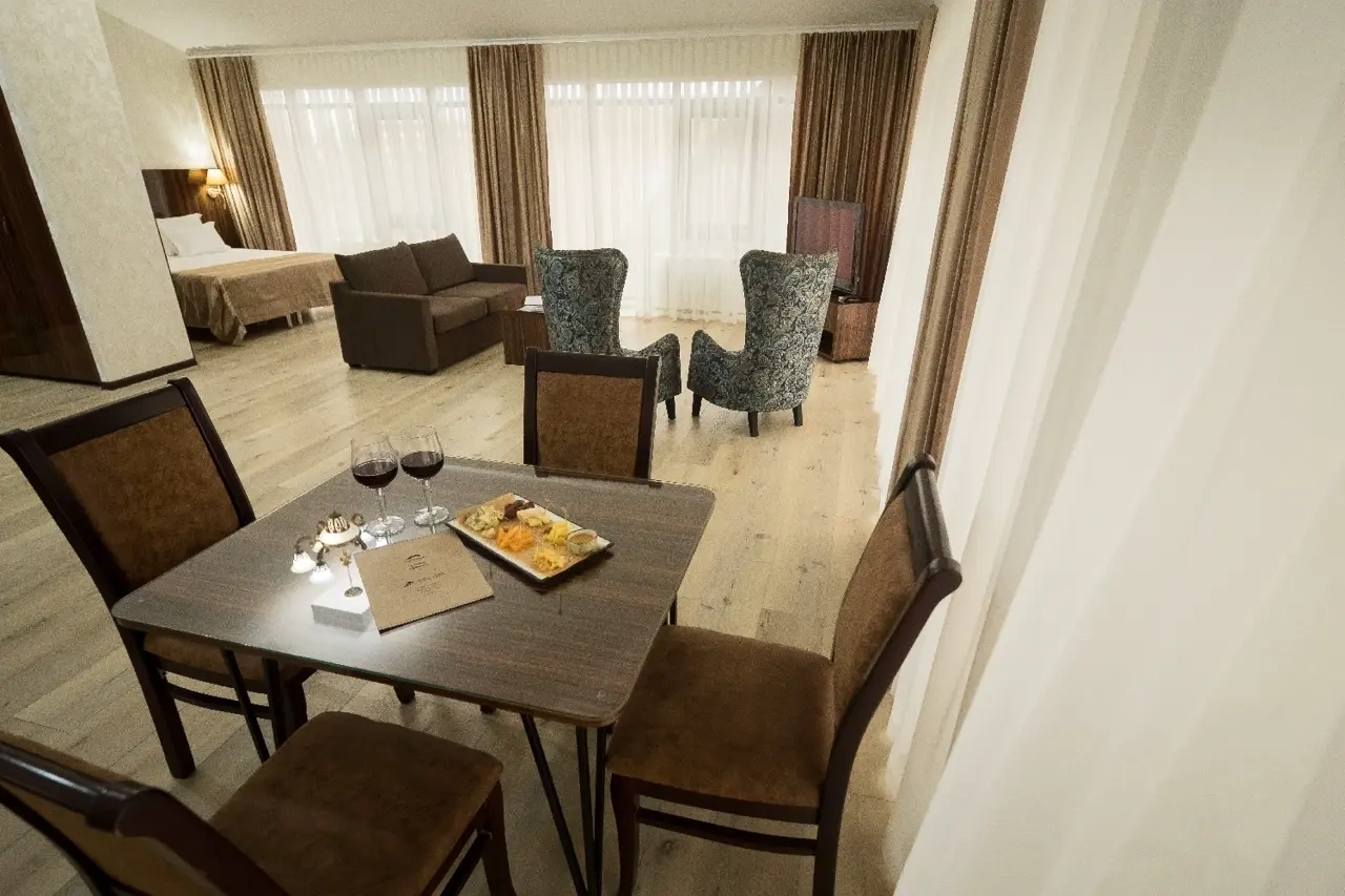 Уютный двухкомнатный номер с двуспальной кроватью гостиной. В номере есть минихолодильник, чайная станция (чай и сахар предоставляются), бутилированная вода, сейф, телевизор. Ванная комната укомплектована косметическими принадлежностями, набором полотенец, халатом и тапочками. Во всех номерах отеля есть балконы. В стоимость включено посещение открытого подогреваемого бассейна, тренажерного зала, сауны и хамам.