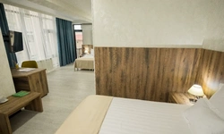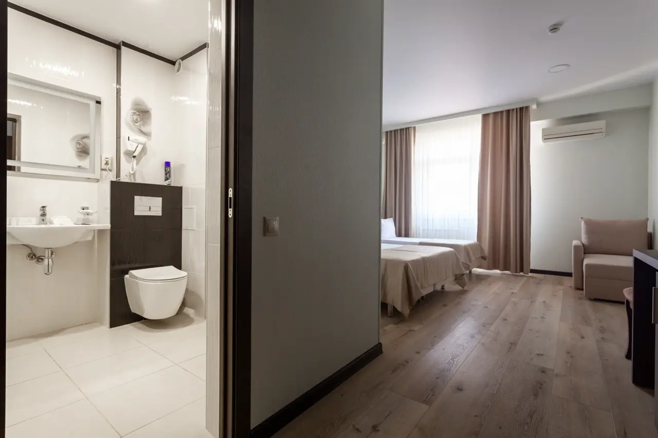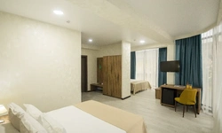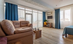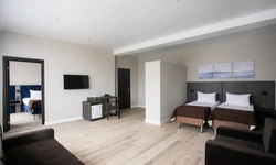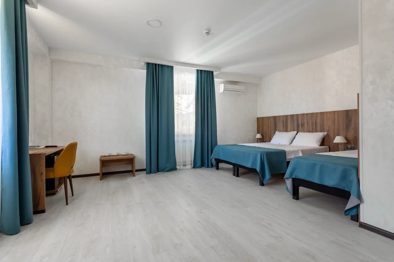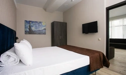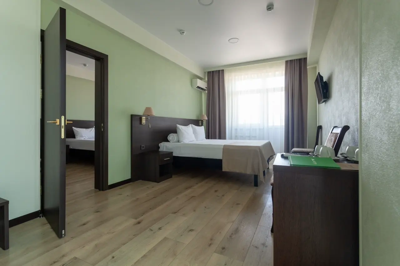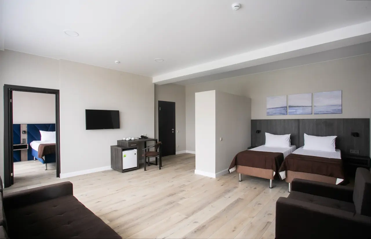 Комфортный двухкомнатный номер с двумя полноценными спальнями. Отлично подойдет для большой семьи или компании. В номере есть минихолодильник, чайная станция (чай и сахар предоставляются), бутилированная вода, сейф, телевизор в каждой спальне.. Ванная комната укомплектована косметическими принадлежностями, набором полотенец, халатом и тапочками. Во всех номерах отеля есть балконы. В стоимость включено посещение открытого подогреваемого бассейна, тренажерного зала, сауны и хамам.