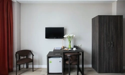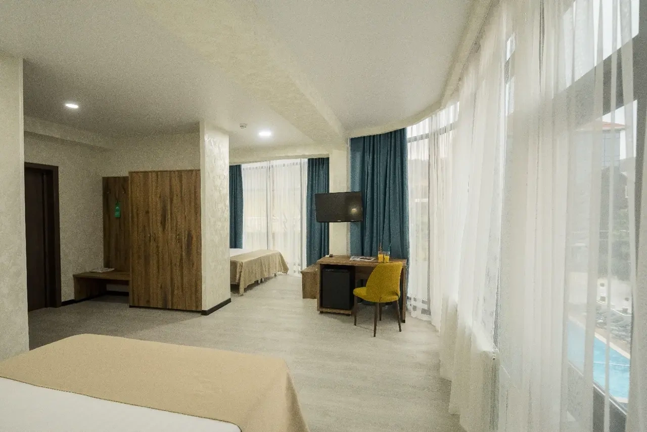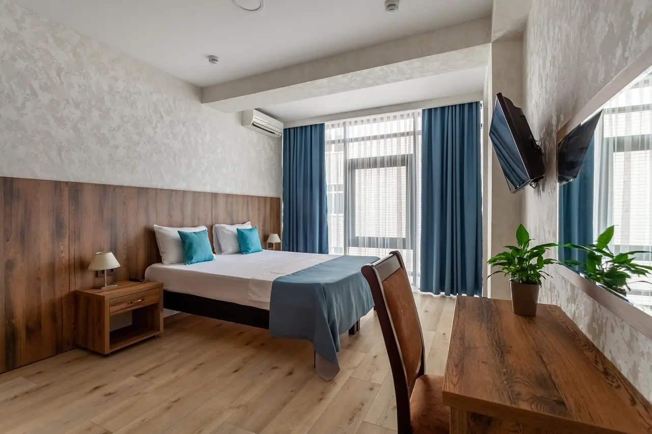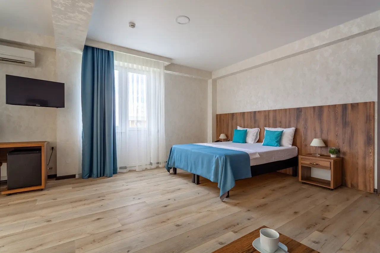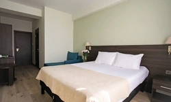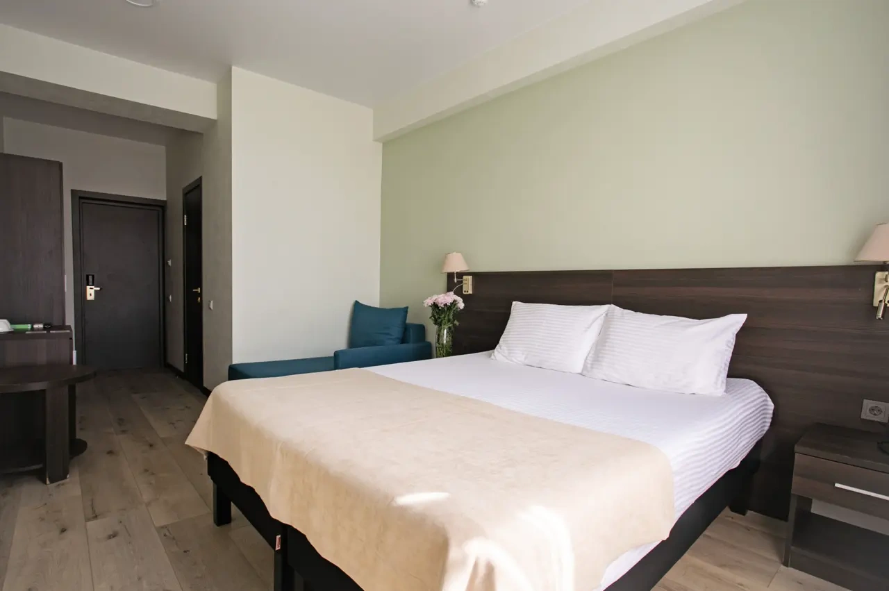 Уютный однокомнатный номер с двуспальной и односпальной кроватями. В номере есть минихолодильник, чайная станция (чай и сахар предоставляются), бутилированная вода, сейф, телевизор. Ванная комната укомплектована косметическими принадлежностями, набором полотенец, халатом и тапочками. Во всех номерах отеля есть балконы. В стоимость включено посещение открытого подогреваемого бассейна, тренажерного зала, сауны и хамам.