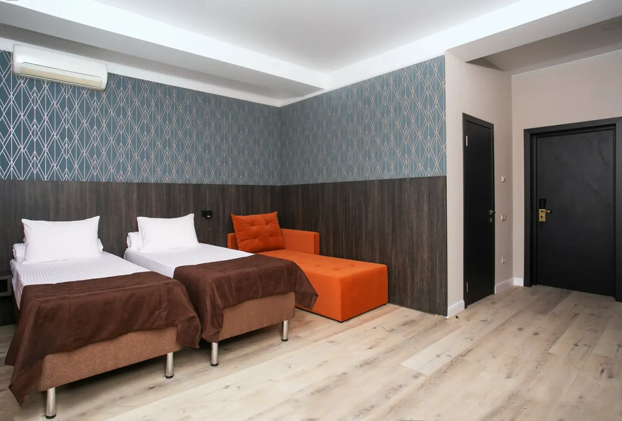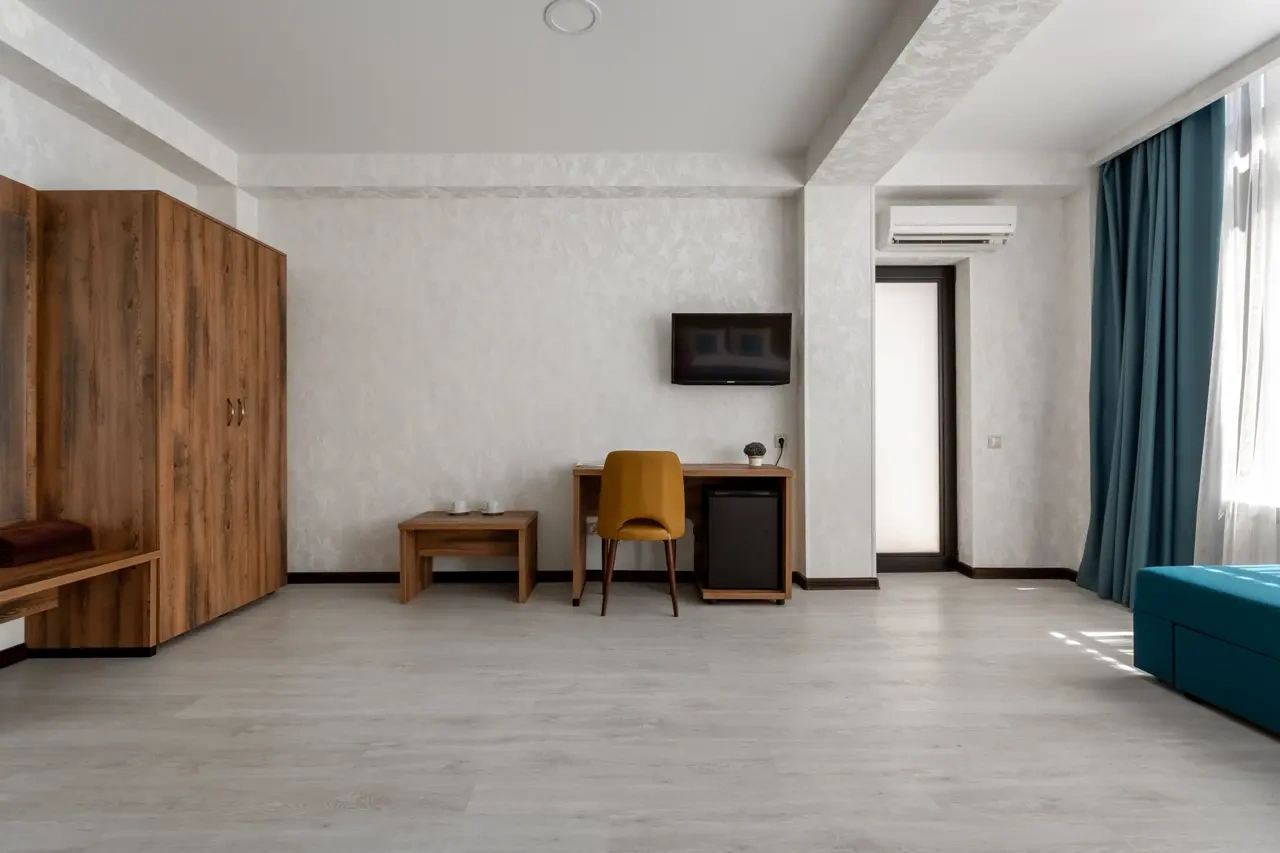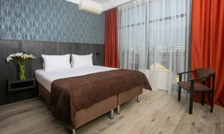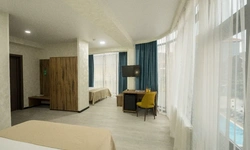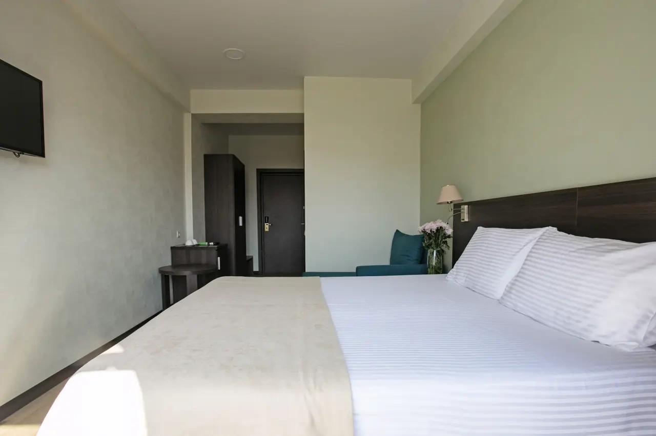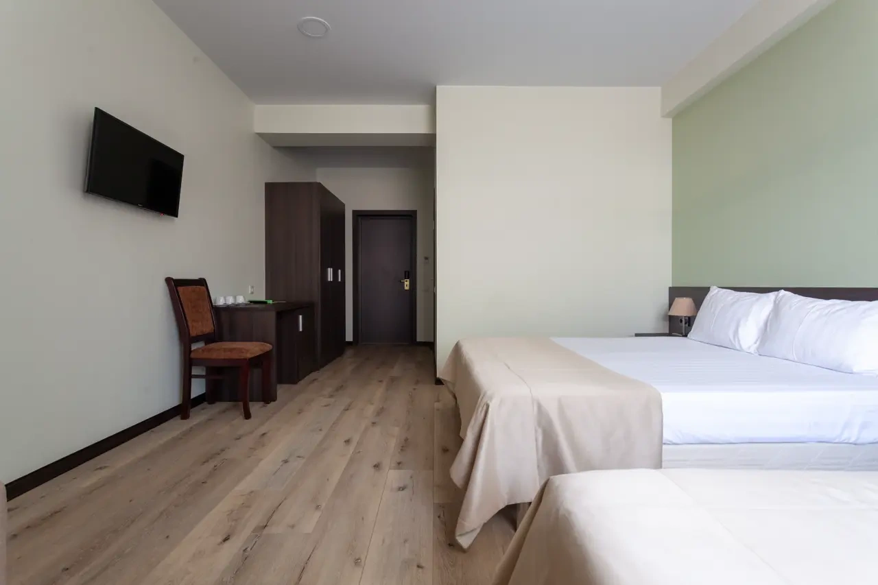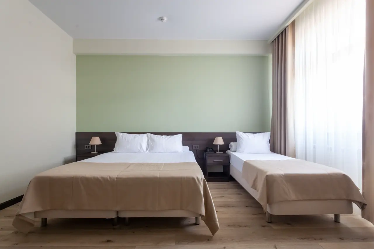 Уютный однокомнатный номер с двуспальной и односпальной кроватями. В номере есть минихолодильник, чайная станция (чай и сахар предоставляются), бутилированная вода, сейф, телевизор. Ванная комната укомплектована косметическими принадлежностями, набором полотенец, халатом и тапочками. Во всех номерах отеля есть балконы. В стоимость включено посещение открытого подогреваемого бассейна, тренажерного зала, сауны и хамам.