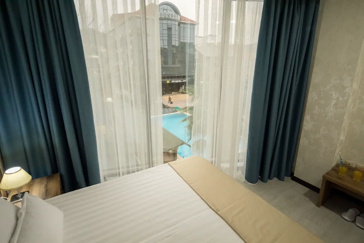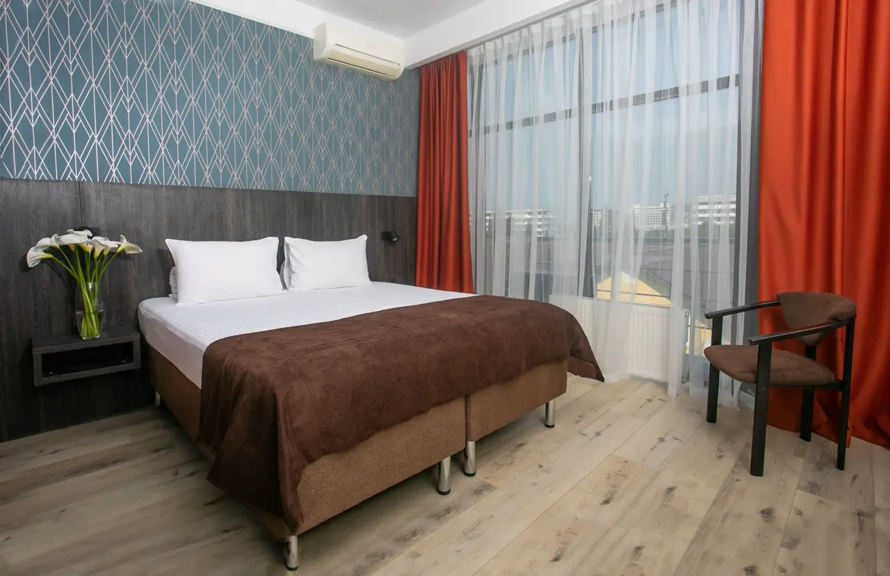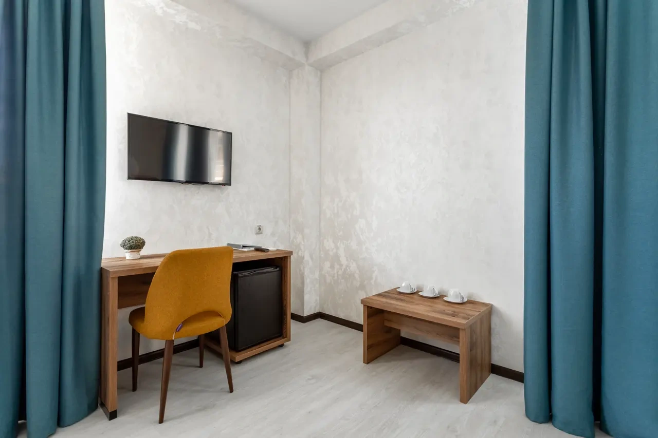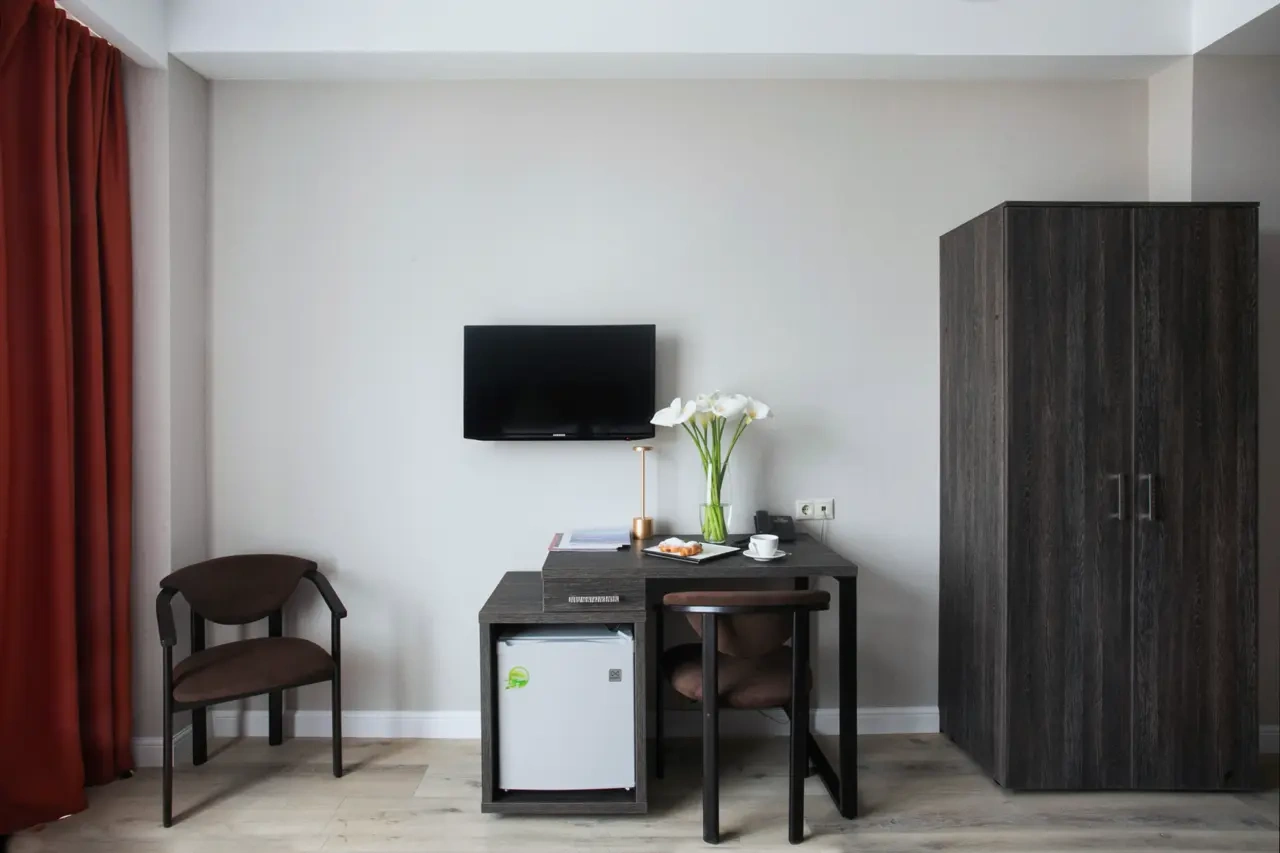 Уютный однокомнатный номер с двуспальной кроватью или двумя раздельными. В номере есть минихолодильник, чайная станция (чай и сахар предоставляются), бутилированная вода, сейф, телевизор. Ванная комната укомплектована косметическими принадлежностями, набором полотенец, халатом и тапочками. Во всех номерах отеля есть балконы. В стоимость включено посещение открытого подогреваемого бассейна, тренажерного зала, сауны и хамам.