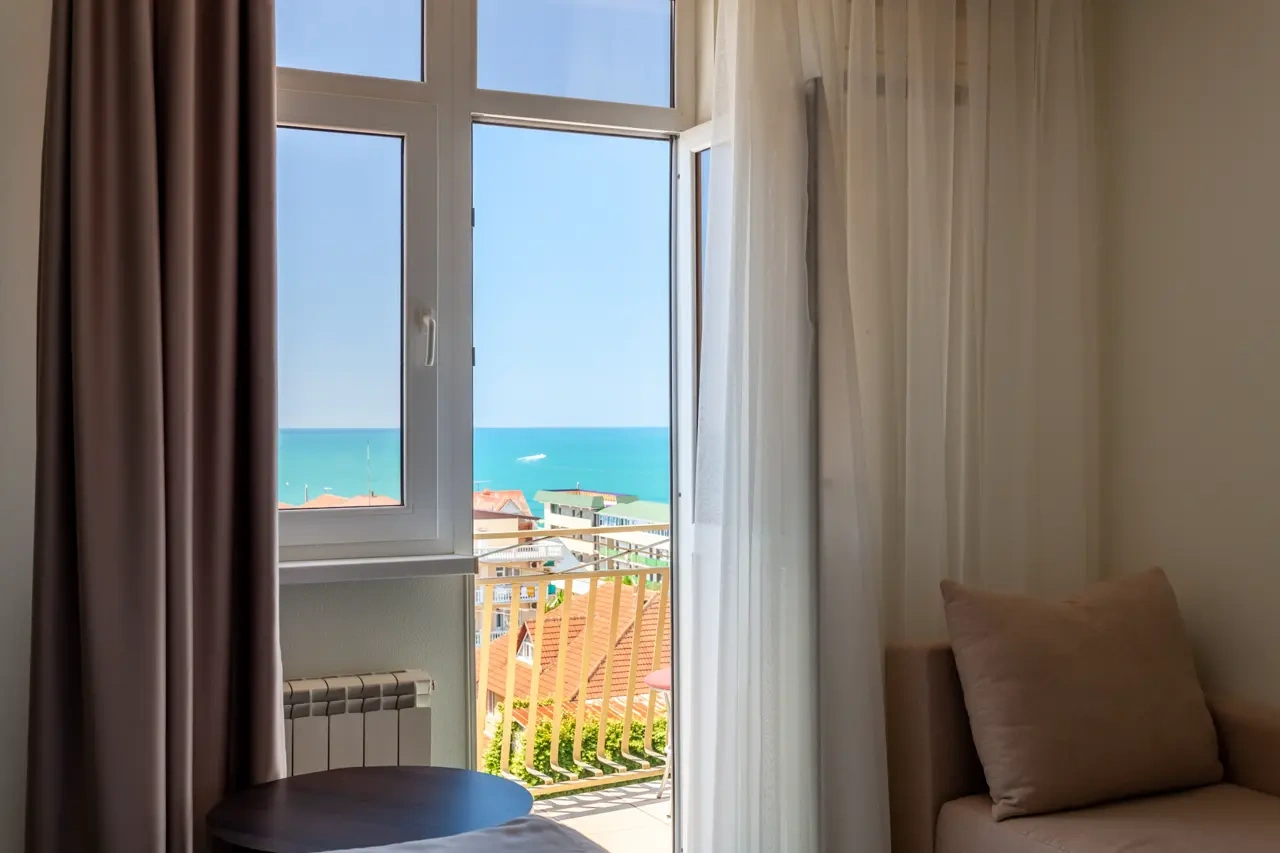 Уютный однокомнатный номер с двуспальной кроватью или двумя раздельными с чудесным видом на море. В номере есть минихолодильник, чайная станция (чай и сахар предоставляются), бутилированная вода, сейф, телевизор. Ванная комната укомплектована косметическими принадлежностями, набором полотенец, халатом и тапочками. Во всех номерах отеля есть балконы. В стоимость включено посещение открытого подогреваемого бассейна, тренажерного зала, сауны и хамам.