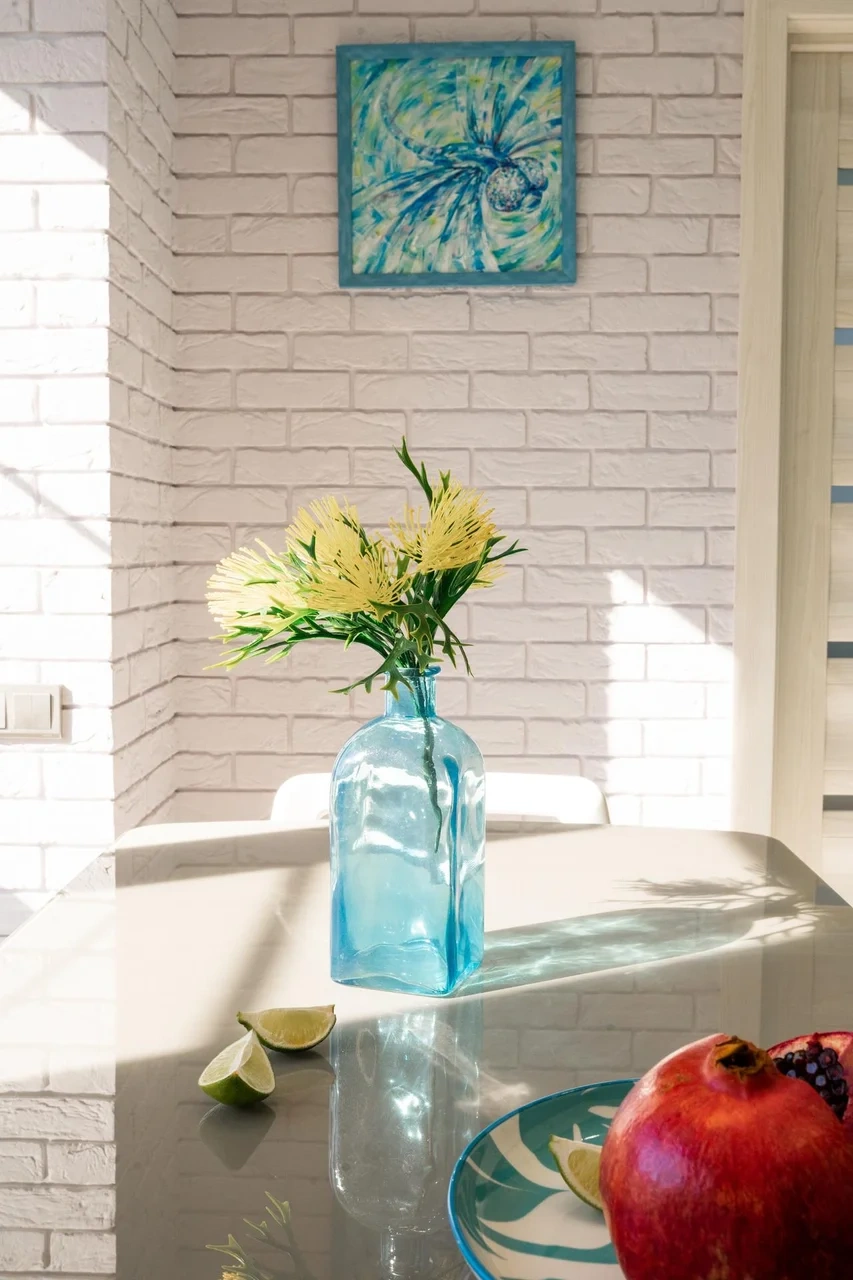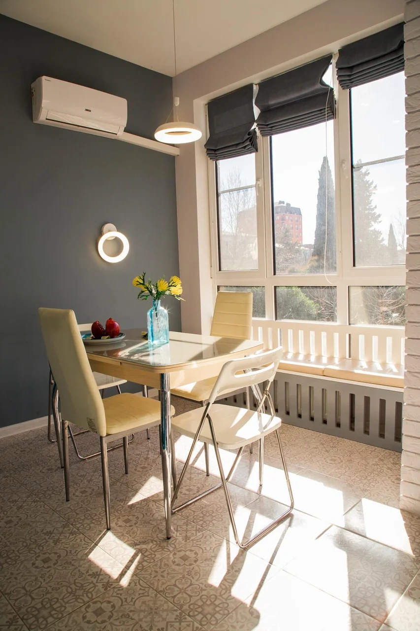 Солнечный свет, заливающий по утрам обеденную зону через панорамное окно, позволяет не только позавтракать с семьей, но и организовать рабочую зону.