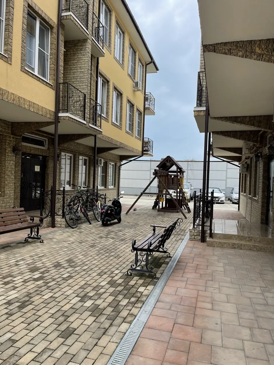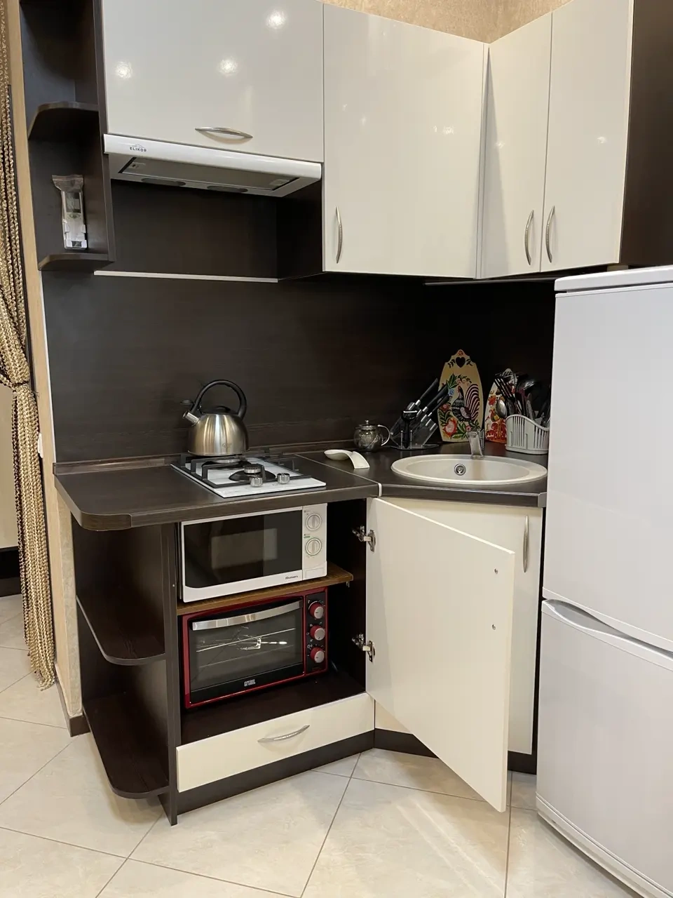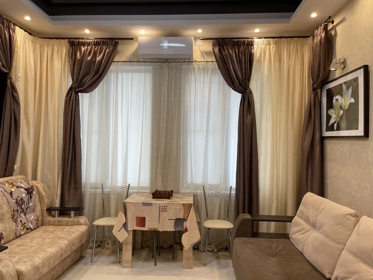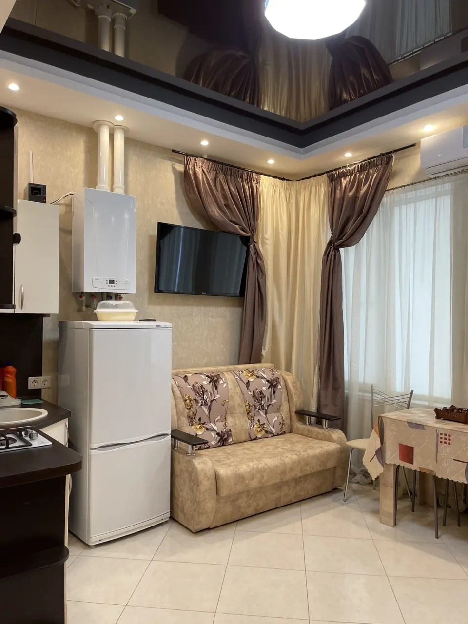 Студия со всеми удобствами оснащена всей необходимой техникой: стиральная машина, холодильник, кондиционер, телевизор, минипечь, микроволновка. Имеется вся необходимая посуда, постельное белье, полотенца. Два раскладных дивана, на которых могут расположиться четыре человека. Окна выходят во двор с видом на детскую площадку. Имеется бесплатная парковка.