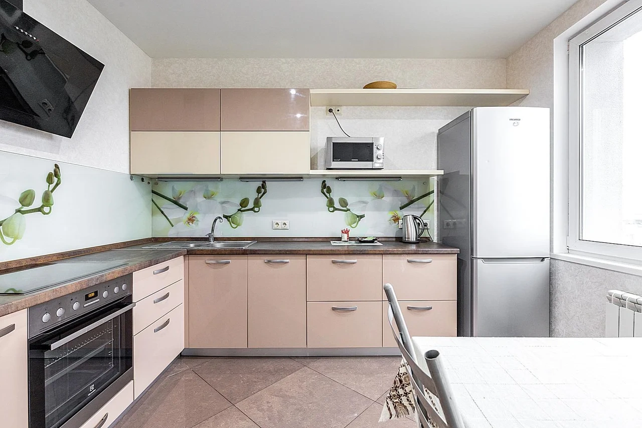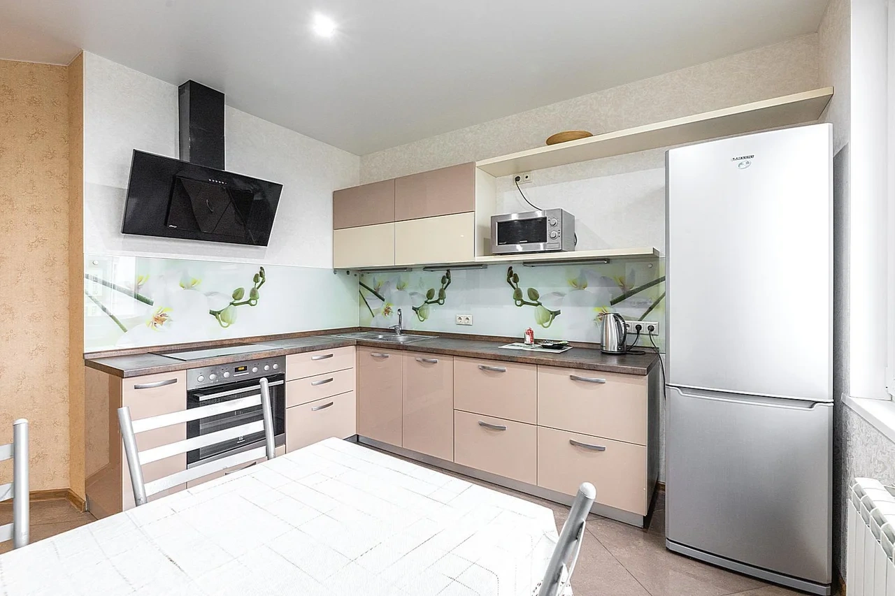Кухонная зоной оборудована варочной панелью, посудомоечной машиной ,свч печь, духовой шкаф, встроенный холодильник и вся необходимая посуда.