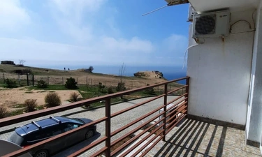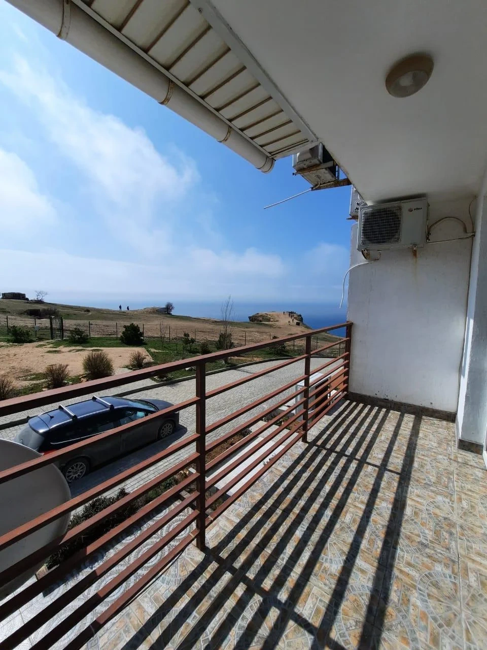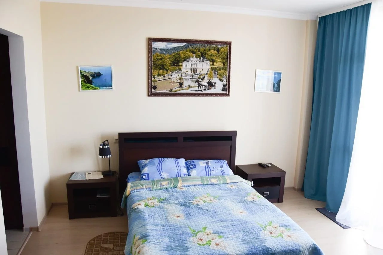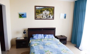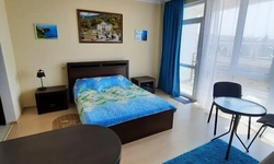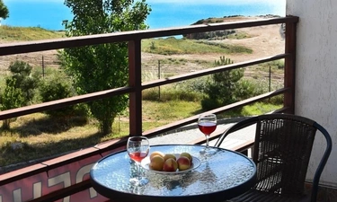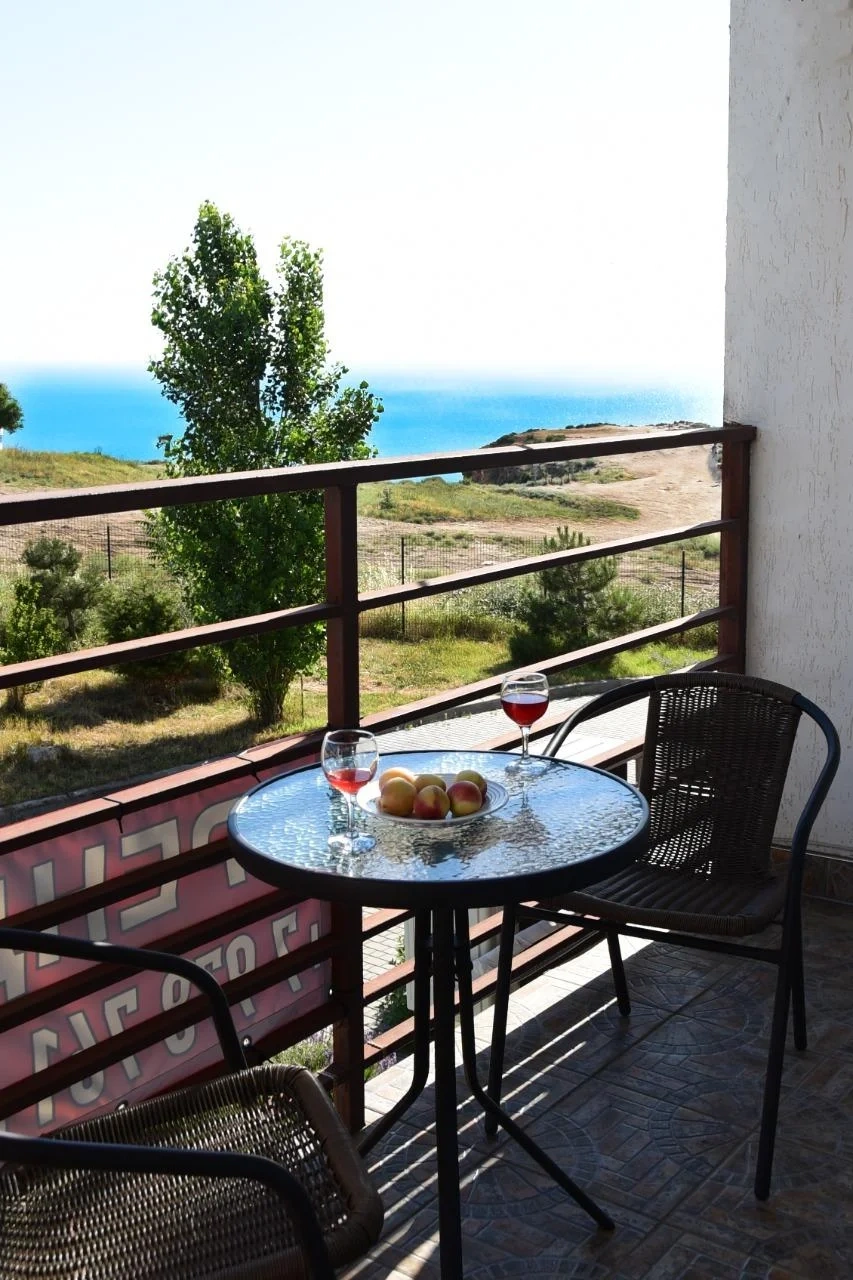 Балкон с видом на море и смотровую площадку мыса Фиолент, на балконе кресла и столик. В апартаментах есть холодильник, шкаф, телевизор смарт и 170 каналов, wi-fi, утюг, гладильная доска, постельное бельё, пледы, полотенца, кондиционер. Двуспальная кровать, есть диван-кровать.