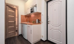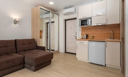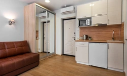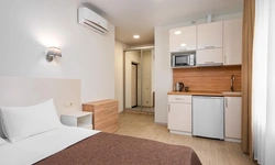 холодильник, кондиционер, письменный стол, шкаф для одежды. Кухонный уголок с