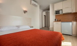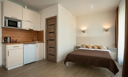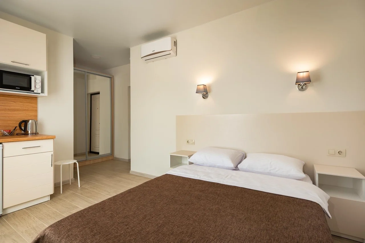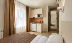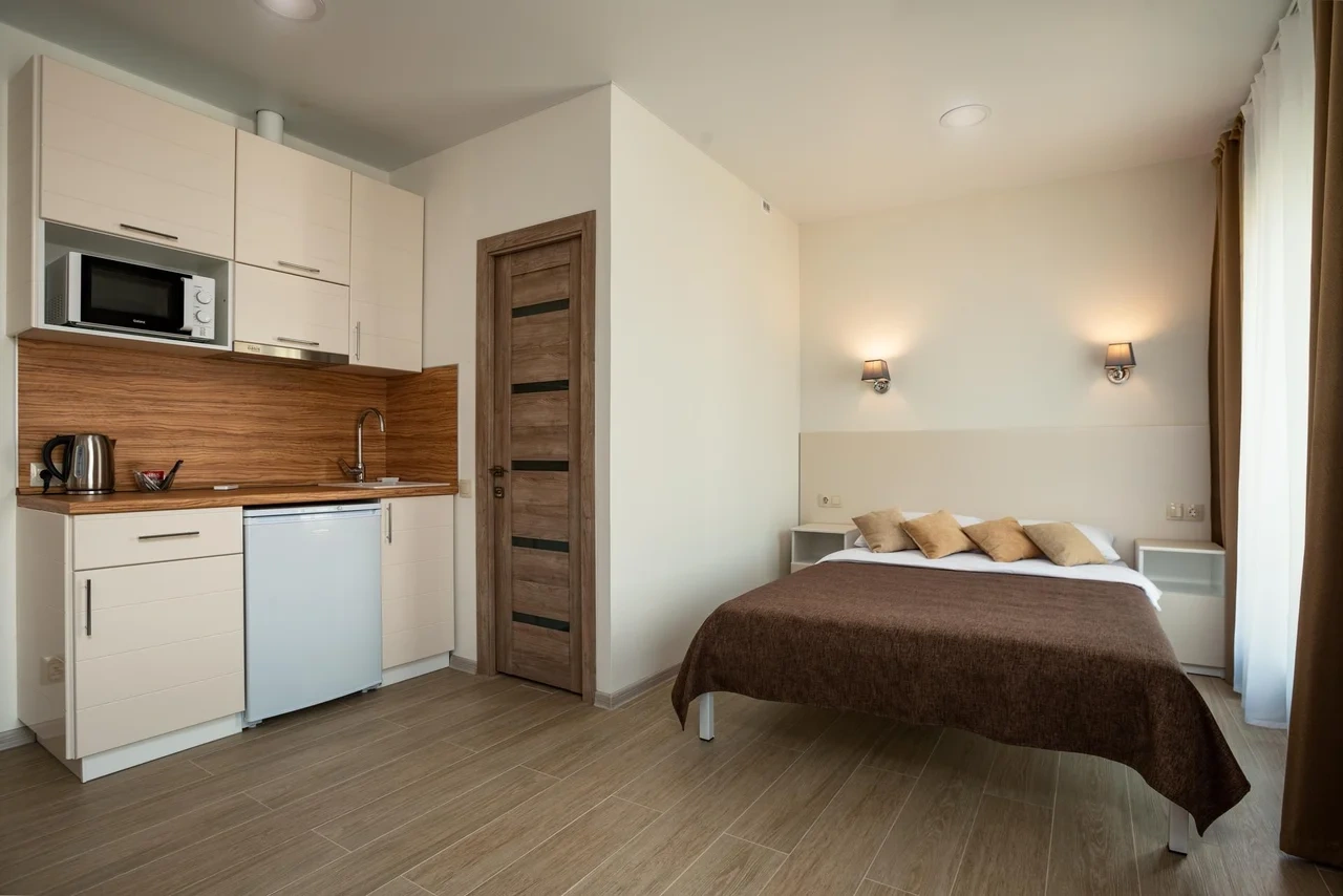 Номер полностью соответствует описанию на сайте, все супер-новое и сделанное со вкусом и с душой, современное и стильное. Есть все необходимое, единственное не хватало балкончика и сушилки для купальников. Порадовал огромный телевизор с топовыми онлайн кинотеатрами, кухонный уголок, раз в 3 дня полная уборка с заменой полотенец и постели, давали водичку, чай и кофе, средства для мытья.