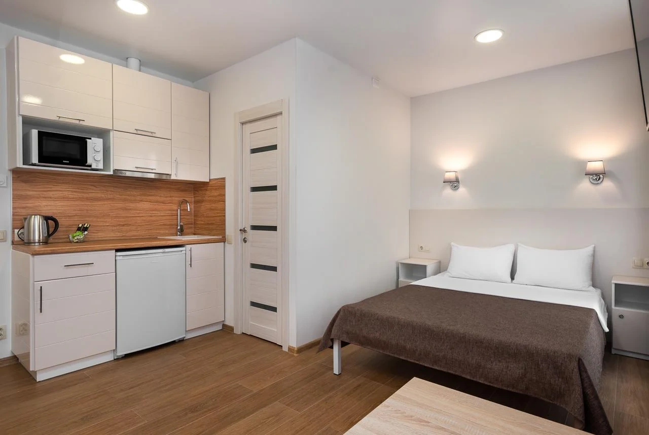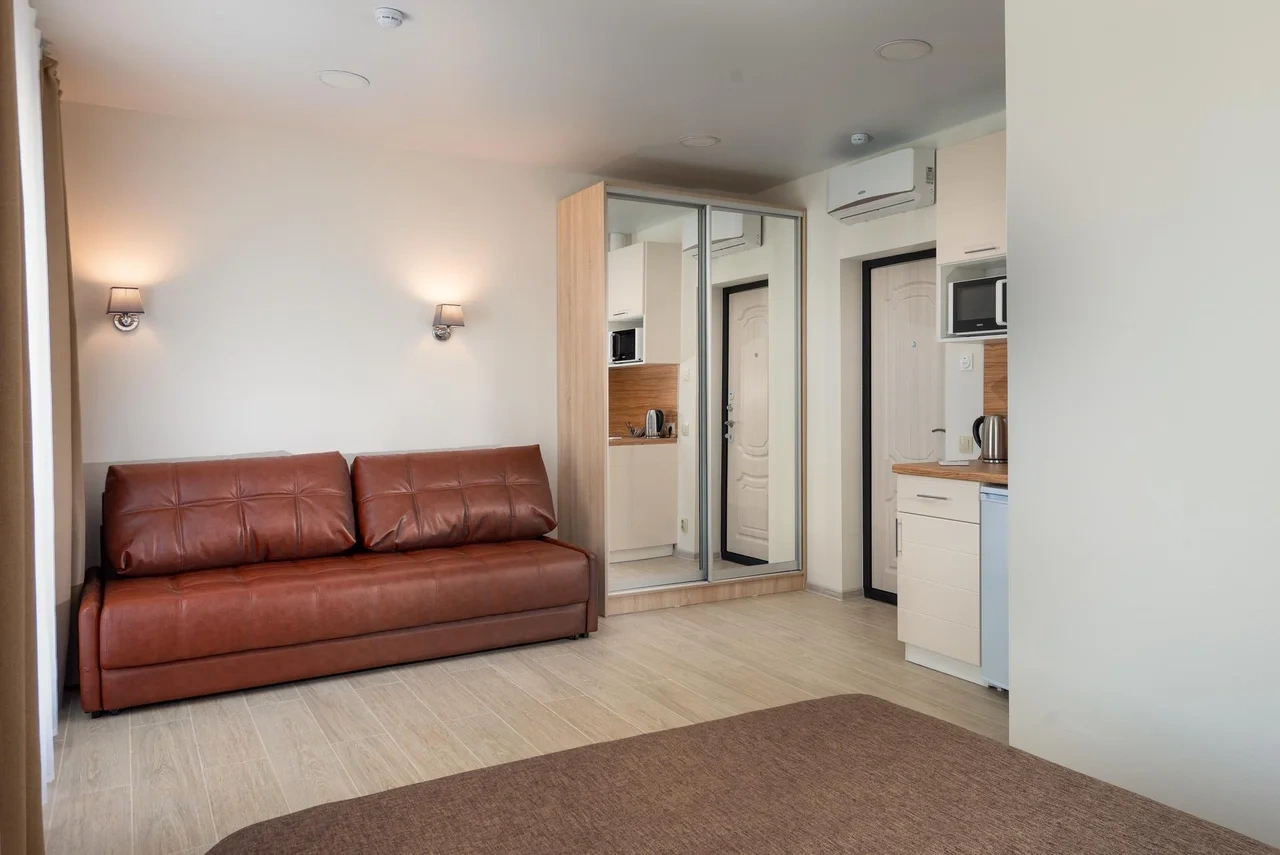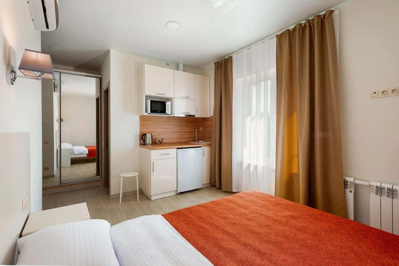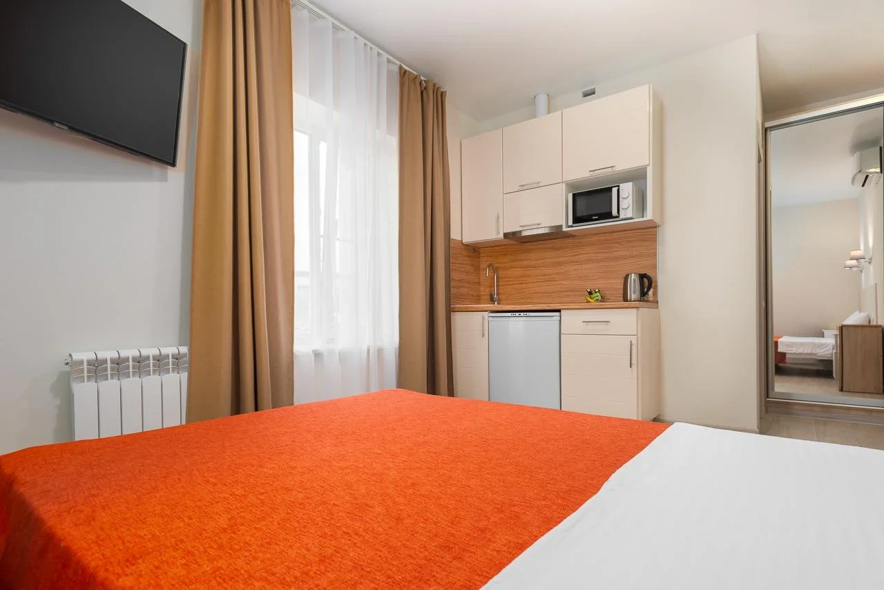 Чисто, уютно, как дома! В номере есть кухня, очень быстрый интернет, современная техника. Хорошая шумоизоляция. Есть парковка во дворе с автоматическими воротами. Владельцы относятся как к своему дому.