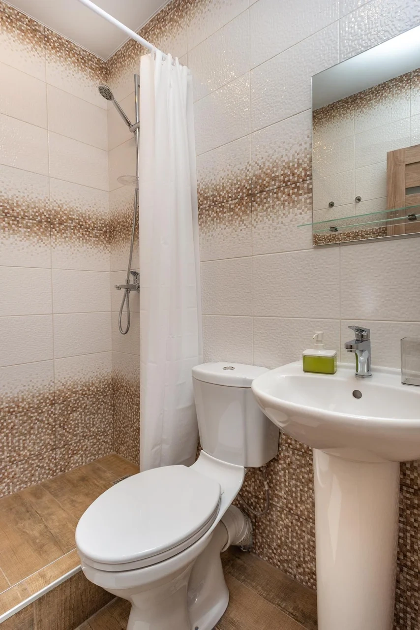 Ванная комната оборудована современной новой сантехникой, душевой кабиной, имеется фен.