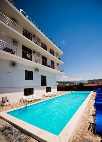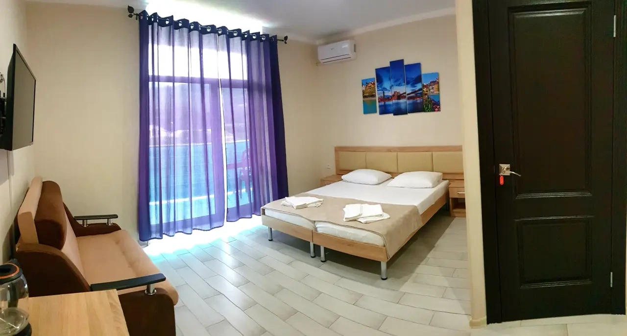 С балкона открывается прекрасный вид на горы и море. На территории отеля есть кафе, где можно позавтракать, пообедать и поужинать. Завтраки не входят в стоимость проживания.