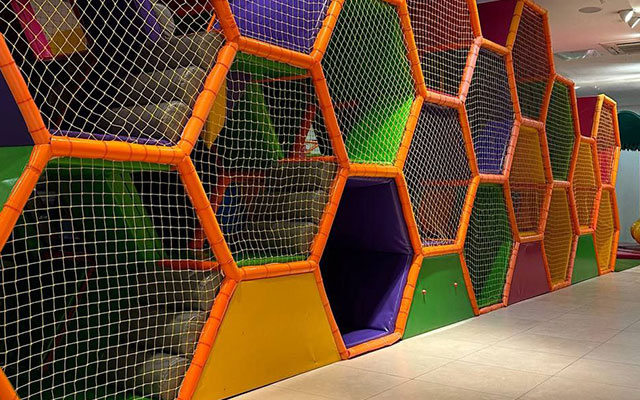 Площадка оборудована вязаным лабиринтом, подвесным сухим бассейном, горками, батутами и другими аттракционами. Также тут есть необычные карусели и пространство для спортивных игр (настольных и не только).
